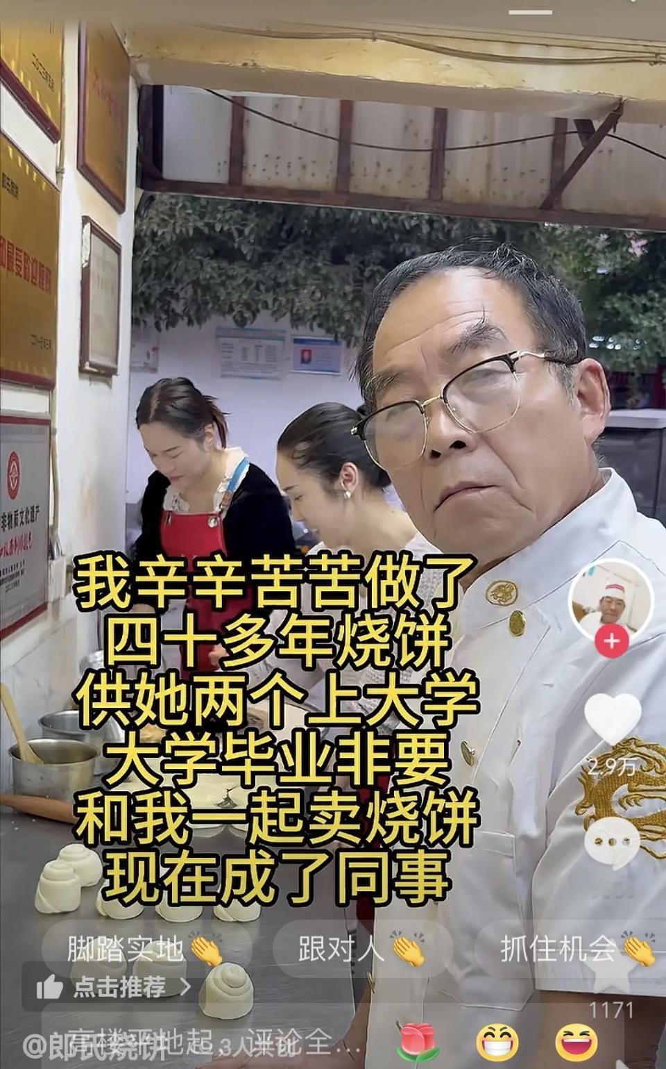 大学的尽头是卖烧饼?刷到那位老师傅的视频真让人五味杂陈——40年揉面烤饼供俩 女儿读大学,最后姑娘们毕业又回到摊位跟他当同事,老师傅那神情,藏着多少说不出的滋味。 有人说这是“白读了”,可我觉得不是。以前总觉得上大学就得脱离“小生意”,要坐办公室才叫体面,其实现在早变了。俩姑娘有文化,能帮老爸把烧饼摊搞线上外卖、做口味创新,说不定比单纯找个普通工作更有奔头,这哪是妥协,是换种方式把日子过好。 再说了,梦想哪有高低?小时候想当科学家,长大帮家里把烧饼卖好,只要心安理得,就不算辜负。比起为了“体面”硬扛996,这样的选择反而更实在。你觉得,大学毕业回家帮衬家里,算没实现价值吗?