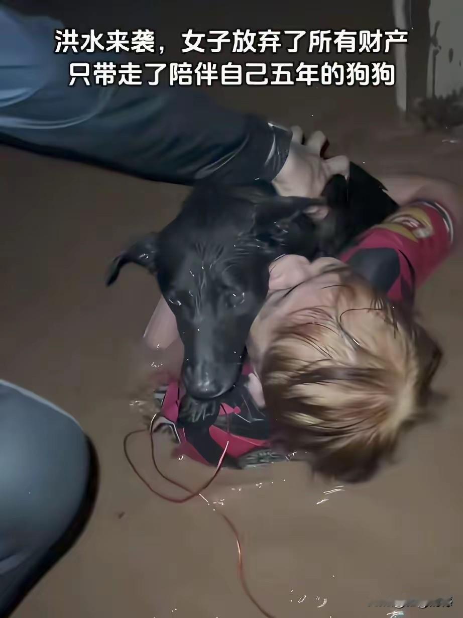 这个女子是真正的喜欢狗,通过长期养狗,人和狗之间已经产生了感情,在洪灾来临之时,