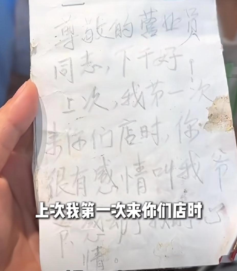 10月3日,江西一位小姐姐的餐馆来了一位老人,递上了一张纸条,上面写的话让小姐姐温暖又心酸! 老人拄着拐杖,步履蹒跚。满脸慈祥的看着小姐姐读完这张字条,小姐姐也开心地笑了。 纸条上清晰地写着:尊敬的营业员同志,你好。上次我来你这里吃饭,你很亲切地喊我爷爷,感动了我的心,谢谢你。 小姐姐回忆起这位老爷爷总是自己一个人来吃饭,而爷爷看起来已经八九十岁了。于是小姐姐表示:“不收钱了爷爷。” 爷爷或许是年龄大了,不方便语言表达,于是又写了一张字条给小姐姐看,上面写着:我一个月退休金6000元。 小姐姐惊呆了,她没想到老爷爷竟然一个月有这么多的退休金。并且老爷爷字迹清秀,想必年轻时一定是一个受人爱戴的知识分子。 而老爷爷以这种方式向陌生人表达着感谢,他的孩子们或许都奔波在外,缺少了对老人的陪伴,老人才会对陌生人的一句“爷爷”而倍感温暖!暖心 暖心瞬间