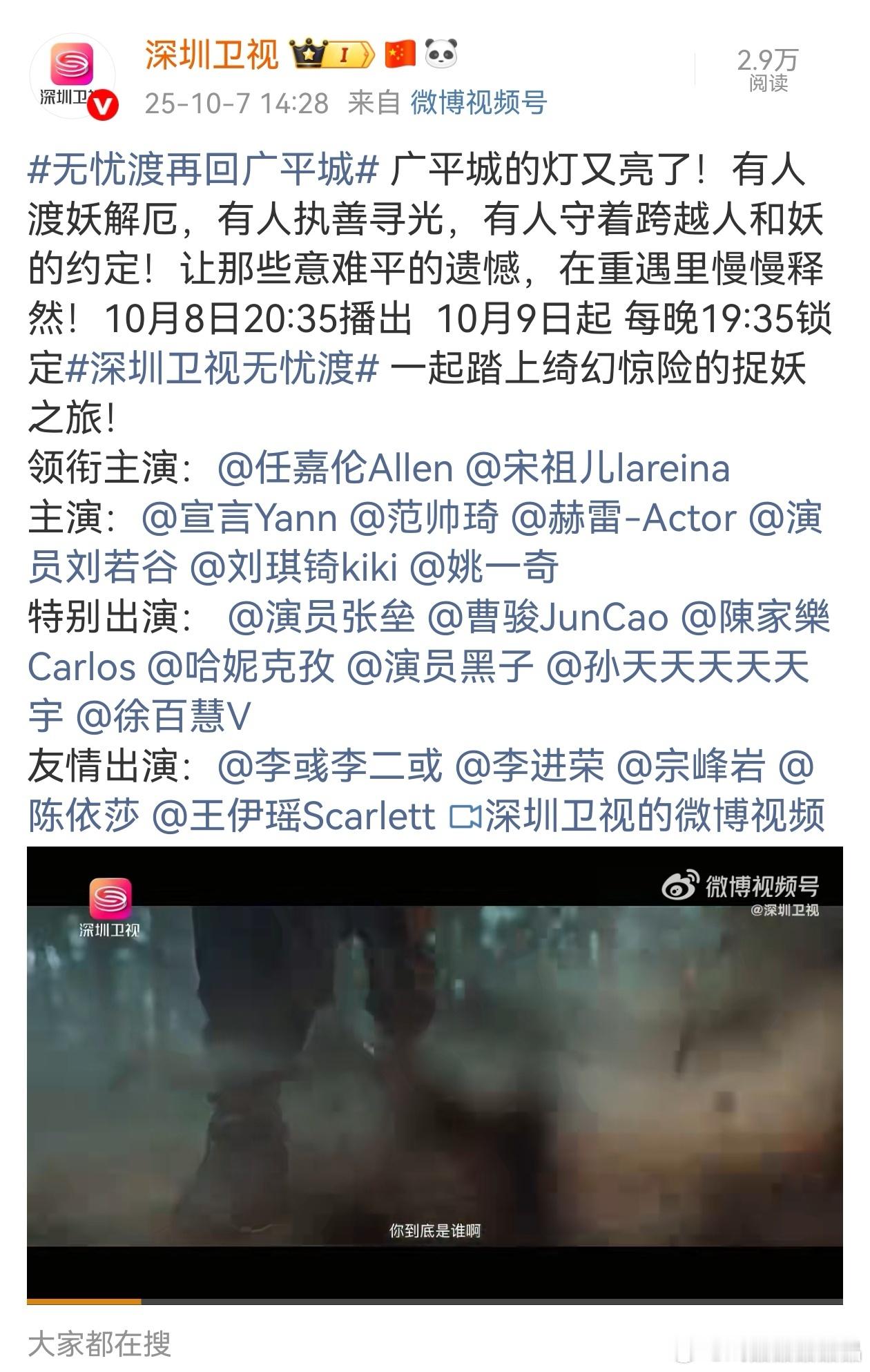 无忧渡在深圳卫视又上星播出,10月8日20:35播出10月9日起每晚19:35锁定深圳卫视,一起踏上绮幻惊险的捉妖之旅!任嘉伦无忧渡