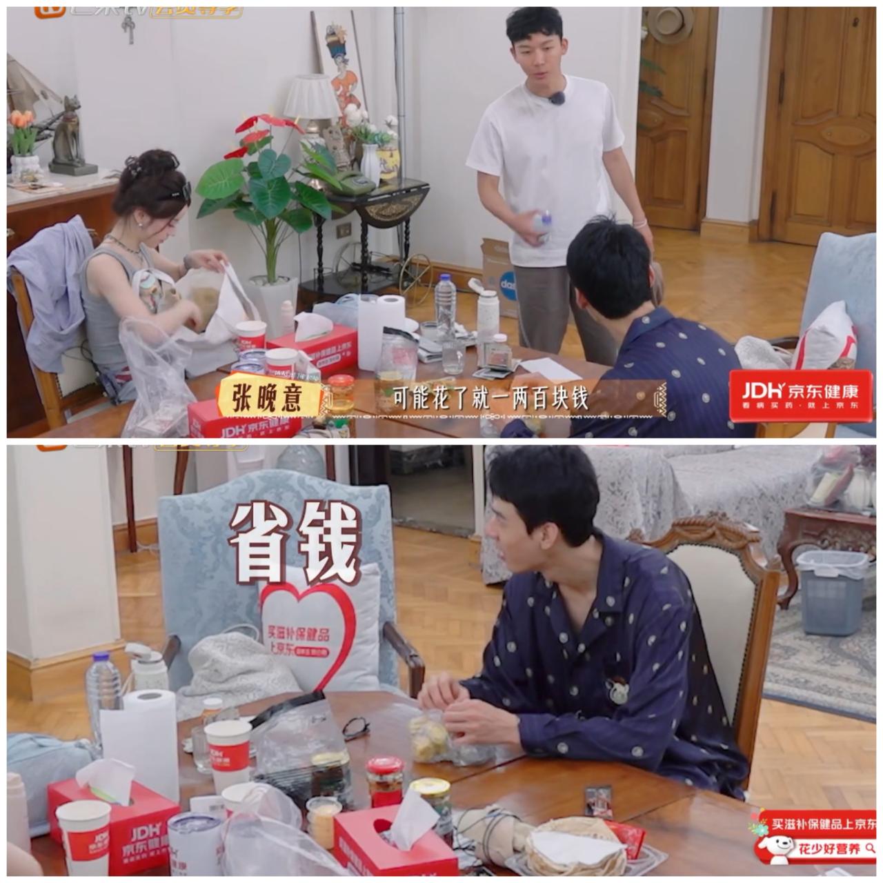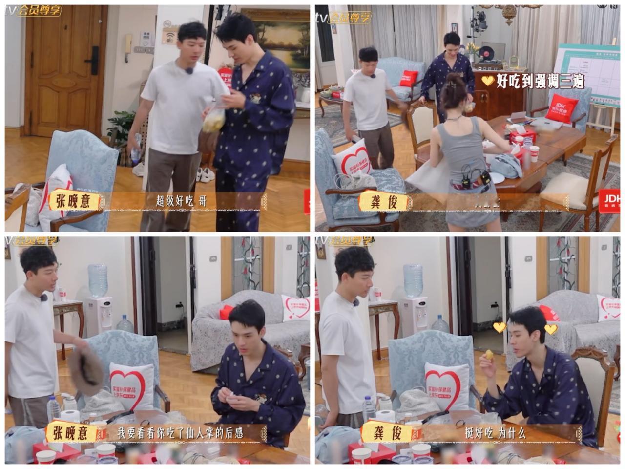 张晚意看来一下子都离不开龚俊, 龚俊缺席夜市活动, 张晚意回去一看到龚俊 就马上拉着他, 强烈“安利”他夜市寻到的 好物。 龚俊因为睡眠不足, 缺席夜市活动, 张晚意一见到他, 就让他尝尝他们买到的 新鲜仙人掌, 赶紧拉哥哥坐下, 也不先洗漱自己, 要看着龚俊吃下这个美食。 龚俊一边吃, 张晚意在一边讲解。 接着张晚意跟龚俊说自己夜市 花费很少, 那个骄傲的样子, 好像要得到龚俊夸奖的样子。 哎呀, 这个情况像极了, 弟弟跟妈妈出去逛街, 哥哥没有去, 结果弟弟回来就要马上 跟哥哥分享自己的“战利品”, 想要得到哥哥的肯定, 让哥哥觉得弟弟也是很了不起的。 看来张晚意真的是和龚俊 处成了亲兄弟的样子, 有一点点小成绩, 就想得到哥哥的认可, 真的把哥哥放在心中的重要的位置。 在姐姐妹妹面前, 张晚意是一个有担当的导游。 在龚俊面前, 张晚意似乎又变成了一个 没有长大的“小屁孩”。 也许在可以信任与依靠的人面前, 才会把那个纯真幼稚的自我放出来吧。 龚俊就是那个可以依靠的“大哥哥”。