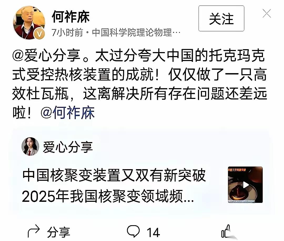 这个何“怨士”,但凡中国取得一点成就,无论是哪个领域的成就,他都会跳高,跳将出来,给予否定。不管他知不知道,不管他熟悉不熟悉,不管是不是自己的领域,不管是不是真的有成就或是没有成就,他都下意识地条件反射,好像形成了肌肉记忆般,进行反对。 有网友纳闷:搞不明白,它院士都混上了,美欧难道能给它更好的? 另有网友给予了解答:何院士老家安徽的,何园了解一下,他的院士怎么来的?他儿子怎么发家的,他子孙后代亲戚又在哪个国家?这老两口门儿清得很。再说了他院士头衔摆在那又没任何拿得出手的,总有刷点存在感,慢慢就成这样了。他整天批文革,其实文革时他是个什么东西他也很清楚。 大家对此怎么看?欢迎在评论区留言,共同交流探讨!何专家