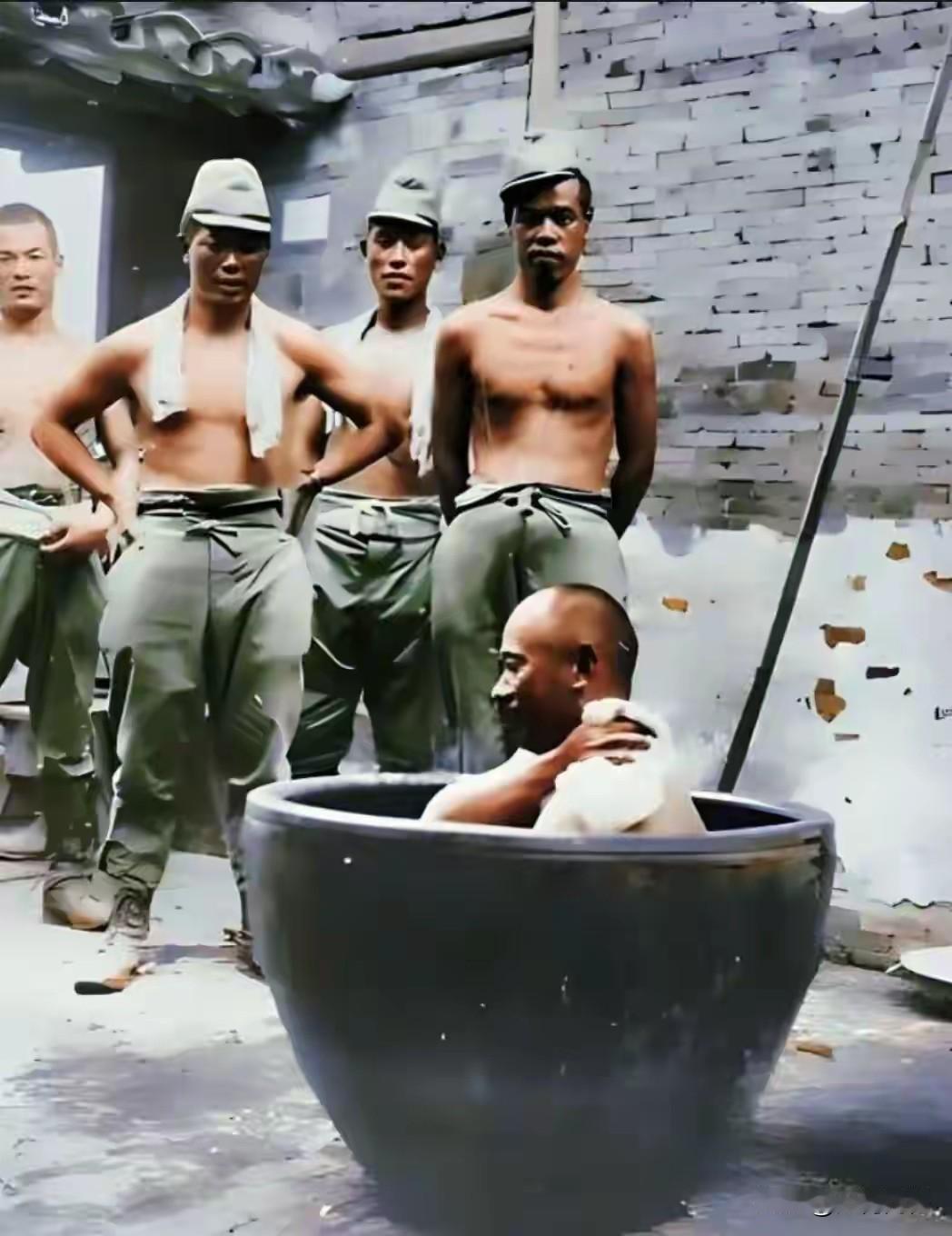 日本鬼子还是很讲究卫生的,但是这些人间恶魔一讲卫生,老百姓可就倒霉了,它们把老百姓家里盛米的大缸逼迫着交出来,把这东西当成泡澡的澡堂子了,里面放上水,就开始在里面洗澡,画面显示的是,一个日本鬼子在大缸里面洗澡,其他几个日本鬼子正在等待着,这是排着号等着洗澡!