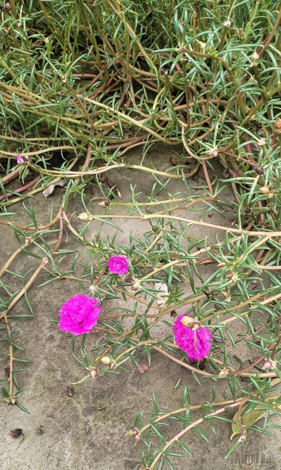 门前的空地上长了很多太阳花。很整齐的样子,大概是母亲专门撒下的种子。 这些太阳花都不单瓣的,都是重瓣的,以前我见到的都是单瓣的太阳花。 这几日阴雨连绵,已经开的花已经腐烂在枝头,那些还没有开的花骨朵,很精神的支棱着。 村里人都不吗这些当花,花与人相静好!