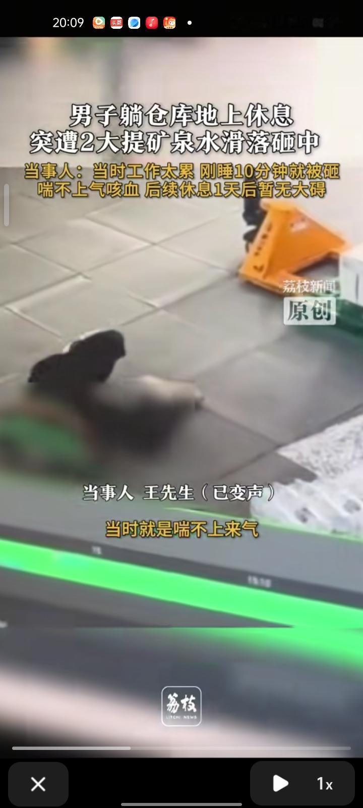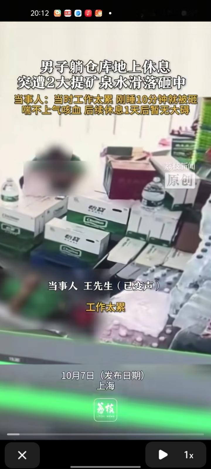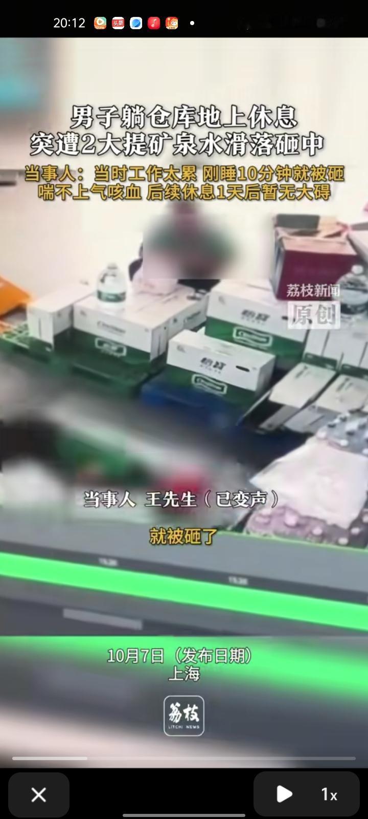 10月5日,上海。一男子工作太累,躺仓库地上休息,遭到两大提矿泉水砸中。当事人表示,当时就是喘不上气咳血,没有去医院,检查肯定是自己花钱,后续休息一天后暂无大碍。