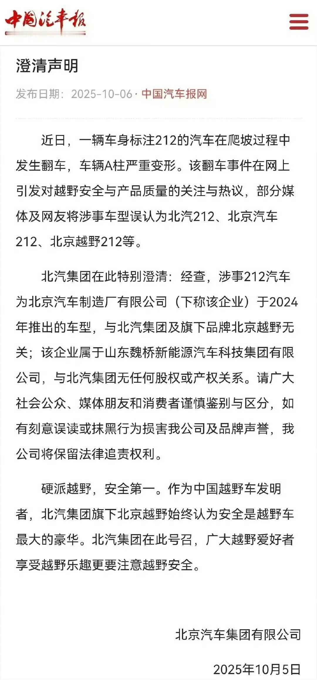 懂车之道讯北汽集团就近日,一辆车身标注212的汽车在爬坡过程中发生翻车,车辆A柱严重变形的事件发布声明:表示涉事212汽车为北京汽车制造厂有限公司(下称该企业)于2024年推出的车型,与北汽集团及旗下品牌北京越野无关;该企业属于山东魏桥新能源汽车科技集团有限公司,与北汽集团无任何股权或产权关系。澄清了视频发布后,部分媒体及网友将涉事车型误认为北汽212、北京汽车212、北京越野212等车型的事实。