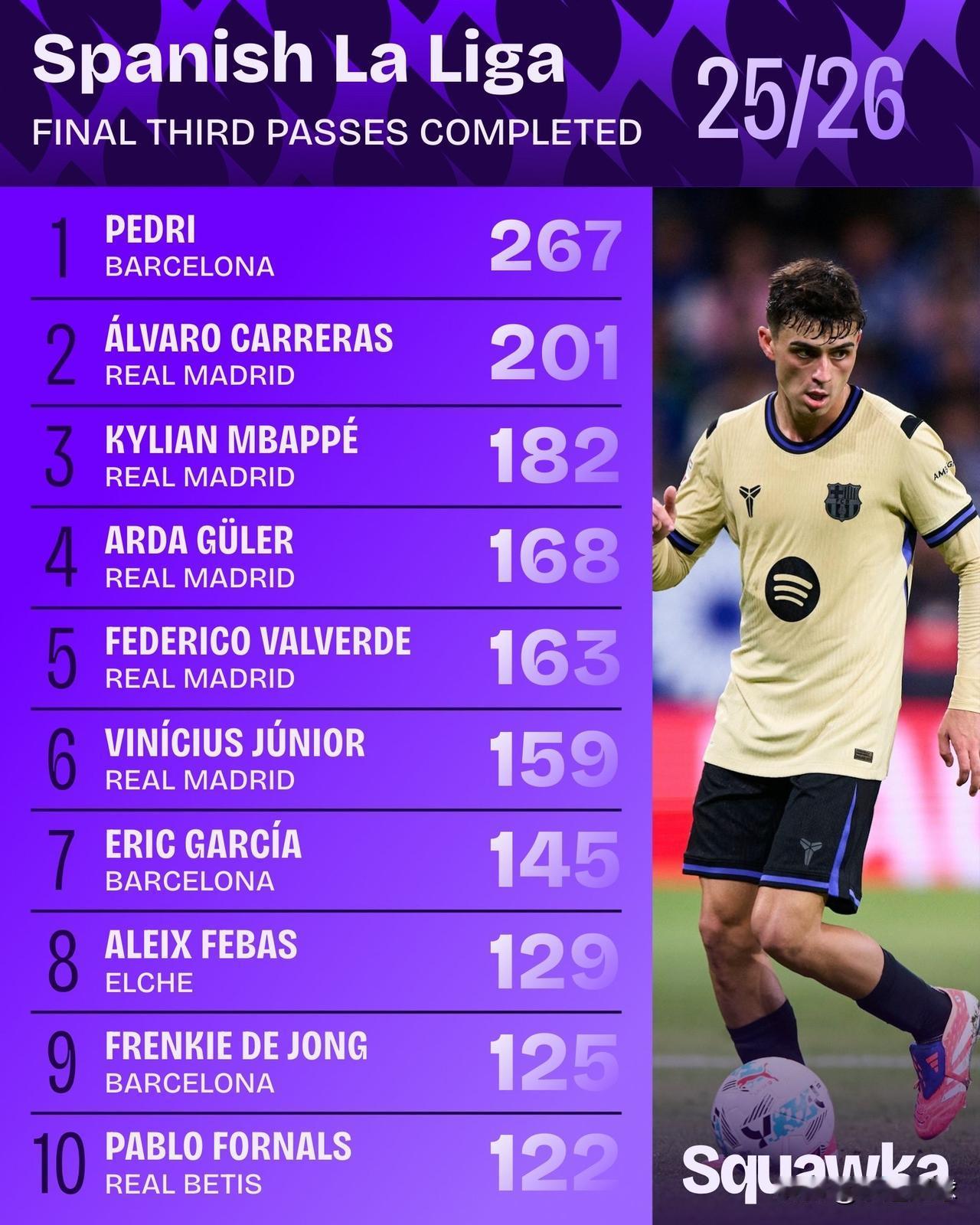 佩德里在欧洲五大联赛所有球员中完成了最多的进攻三区传球(Final third passes)。 同时,他也是五大联赛中唯一一位在对方半场完成500+次传球(实际522次)的球员,比西甲其他球员至少多出213次。 另外,佩德里的进攻三区传球成功率高达89%,远超同位置球员平均水平(约78%),其“小范围连续一脚出球”能力是巴萨打破密集防守的关键。