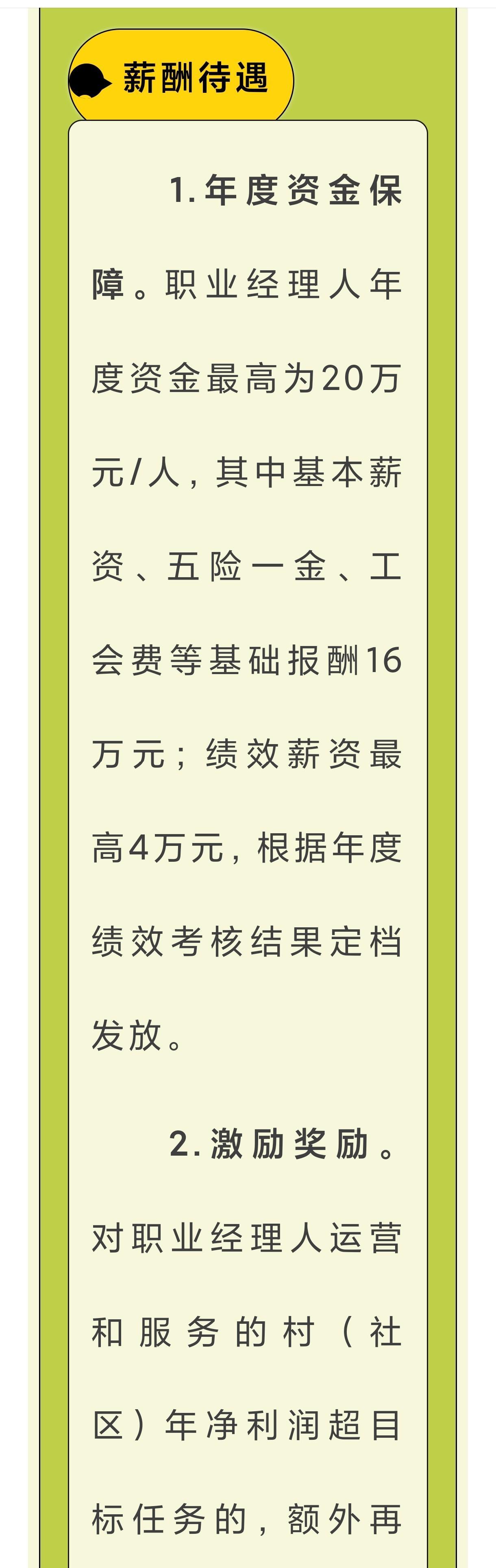 村长是“职业经理人”,创新创业还得看浙江。杭州临平区年薪20万+招聘农村职业经理人!把村庄完全当做一个市场主体、当做一个企业来经营,可以说首开全国之先河。 基本要求是30-45周岁,本科以上。最高年薪为20万元/人,其中基础报酬16万元,绩效最高4万元,超出村(社区)年净利润超目标任务的,额外再奖励。 这为乡村振兴、集体资产增值保值的创新务实举措,可以解决农村专业经营人才匮乏、村组干部家族化等问题,村民可以得到实实在在的好处!全国都应该推广。