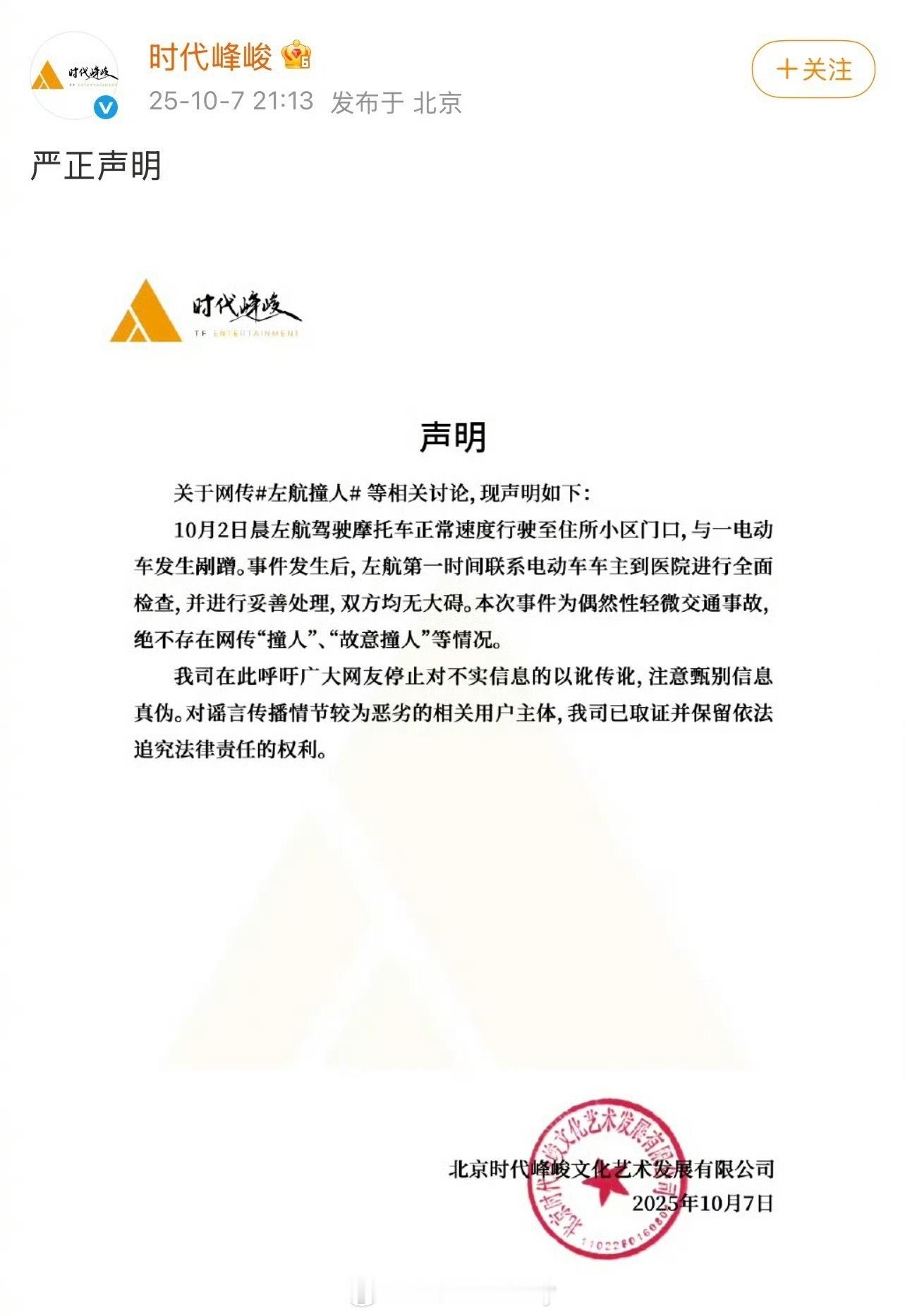 时代峰峻发布声明,回应网传左航撞人事件左航撞人