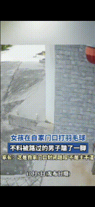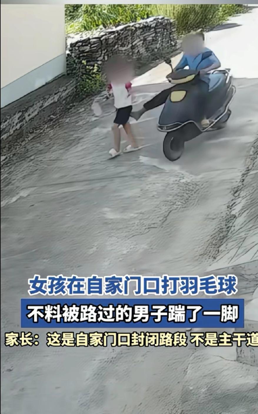一小女孩在自家门口的 水泥路上打羽毛球 被后边骑电动车的人踢一脚 小女孩都懵了 不知道骑电车的人为什么要去踢女孩一脚 如果怕车子碰到孩子,完全可以按一下喇叭 或者从旁边放慢速度骑过去 不知道为何要去踢一脚[what]
