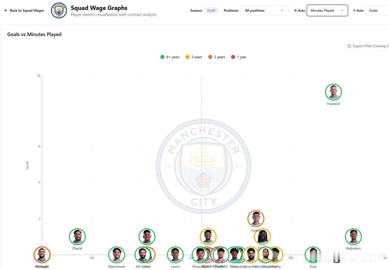 在赛季当前阶段(2025年10月),这一论断还为时过早。 哈兰德在英超的非点球预期进球值(npxG)已达7.7,远超排名第二的马特塔(3.3)和第三的恩佐(3.0),堪称断档级的存在。 而曼城紧随其后的是赖因德斯(1.0,第二)和福登(0.8,第三)——尽管他们的数据与其他英超同位置球员相比已算合理,但赛季初样本量较小,仅一场比赛就可能让数值翻倍并颠覆现有认知。 因此,讨论焦点应转向全队为哈兰德创造的机会效率,毕竟曼城的进攻体系远未达到本赛季的潜力上限。
