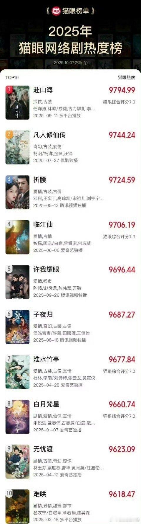 我去 2025年猫眼网络剧热度榜来了:成毅的赴山海第一!!!影视寒冬