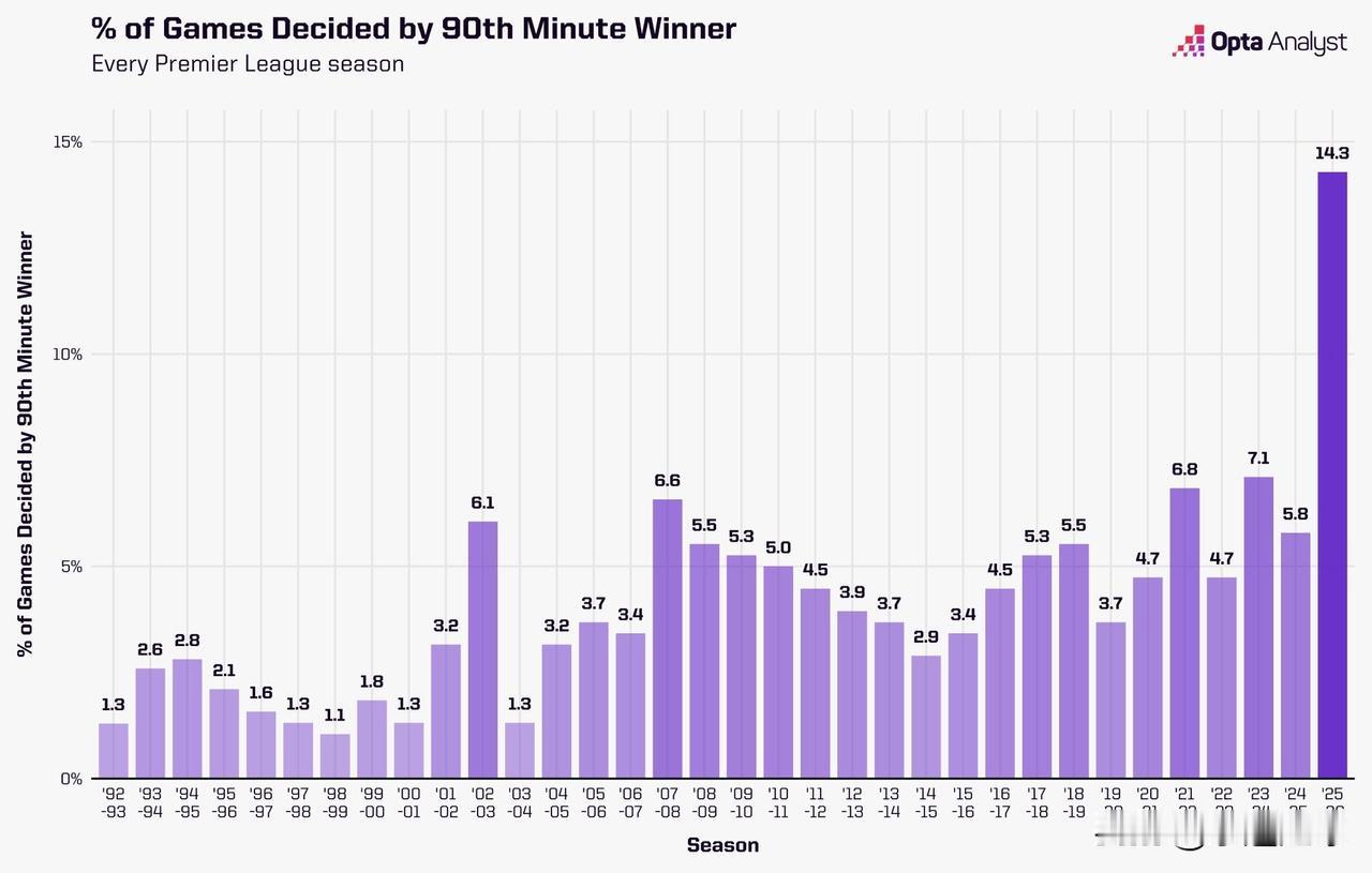 本赛季英超联赛中有14.3%的比赛(70场比赛中有10场)通过第90分钟的绝杀球决定胜负。 这一比例是英超历史上其他赛季的两倍以上。 关键数据亮点: 1. 历史性峰值:2025-26赛季的14.3%占比,较历史最高纪录(2021-22赛季的7.1%)实现翻倍增长,相当于每7场比赛中就有1场通过90分钟绝杀决定胜负。 2. 时代对比: - 早期赛季(1992-2000):比例持续低于3%,最低仅1.1%(1998-99赛季) - 新世纪初期(2000-2010):首次突破6%(2006-07赛季达6.6%) - 近五年(2020至今):比例持续高位运行,均超过5.8% 3.这反映了现代足球的特征:2020年后绝杀比例明显高于历史平均水平,反映比赛节奏加快、竞争强度提升,2025-26赛季异常值即是最好的说明。