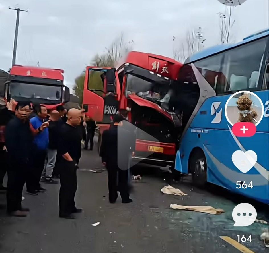 啊呀,太可怕了! 一辆客运大巴与一辆大货车相撞 车的车头都被撞的变形了 可以想想