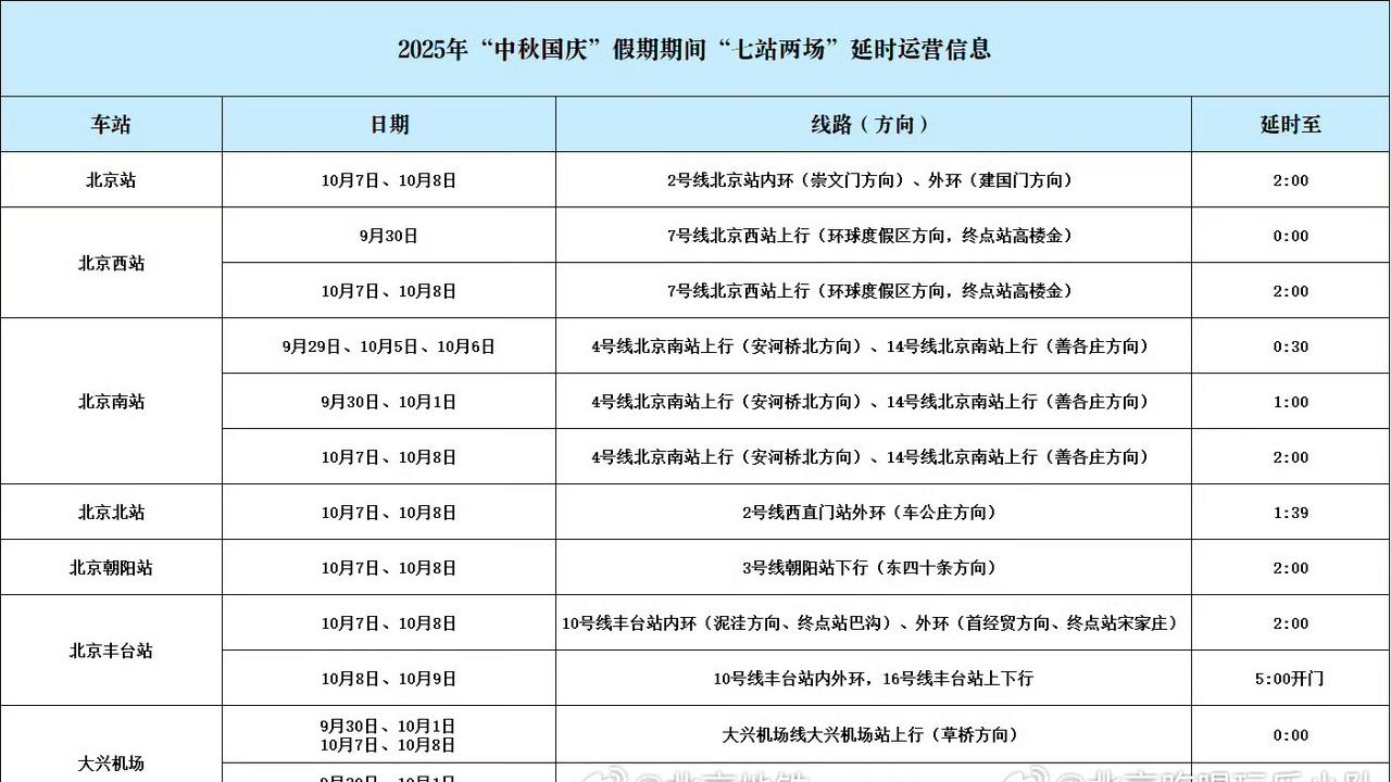 为做好中秋国庆假期期间“七站两场”接续运输服务保障工作,满足乘客出行需求,地铁2号线、3号线、4号线、7号线、10号线、14号线、19号线和大兴机场线8条线路将分别采取延时运营措施,10号线、16号线丰台站采取提前开门运营措施。 一、北京站 10月7日、8日地铁2号线北京站内外环末班车延时运营至次日凌晨2:00。 二、北京西站 9月30日地铁7号线北京西站上行(终点高楼金站)末班车延时运营至次日凌晨0:00,10月7日、8日地铁7号线北京西站上行(终点高楼金站)末班车延时运营至次日凌晨2:00。 三、北京南站 9月29日和10月5日、6日地铁4号线北京南站上行、14号线北京南站上行末班车延时运营至次日凌晨0:30,9月30日、10月1日地铁4号线北京南站上行、14号线北京南站上行末班车延时运营至次日凌晨1:00,10月7日、8日地铁4号线北京南站上行、14号线北京南站上行末班车延时运营至次日凌晨2:00。 四、北京北站 10月7日、8日地铁2号线西直门站外环末班车延时运营至次日凌晨1:39。 五、北京朝阳站 10月7日、8日地铁3号线北京朝阳站下行末班车延时运营至次日凌晨2:00。 六、北京丰台站 10月7日、8日地铁10号线丰台站内外环末班车(巴沟-丰台站-宋家庄)延时运营至次日凌晨2:00;10月8日、9日地铁10号线、16号线提前至5点开门运营。 七、大兴国际机场 9月30日和10月1日、7日、8日,地铁大兴机场线大兴机场站上行末班车延时运营至次日凌晨0:00,19号线草桥站上行末班车延时运营至次日凌晨0:30。 请乘客提前安排好出行计划,详情可拨打地铁服务热线96123、96165。(北京地铁)