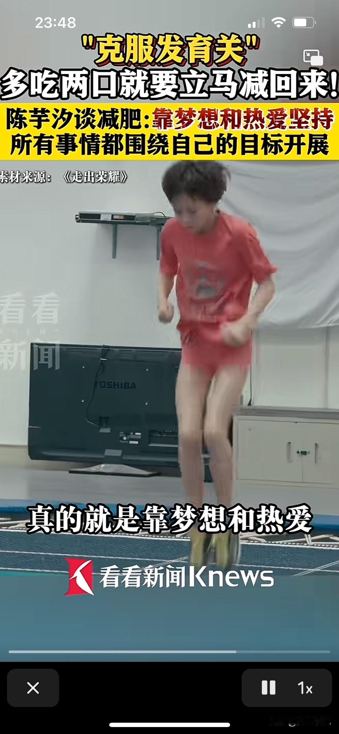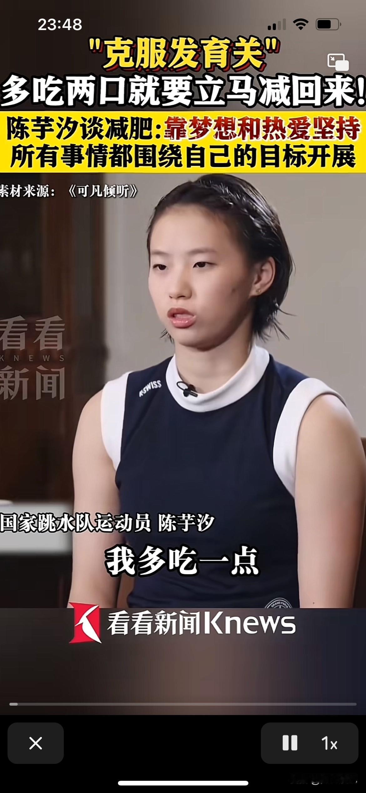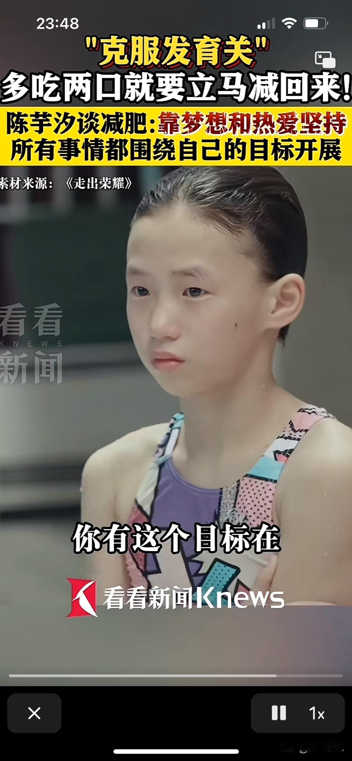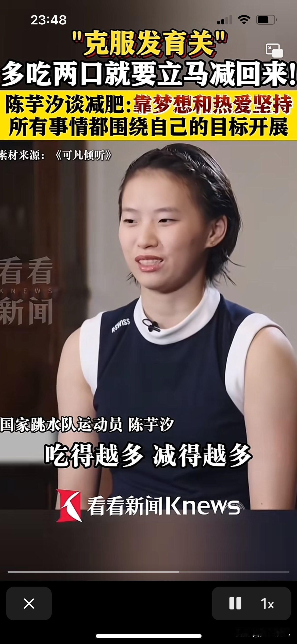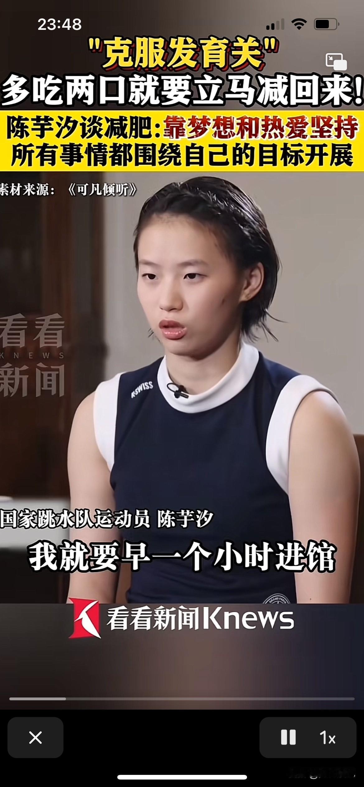 陈芋汐自曝自己减肥的秘密,多吃一点就要提前一个小时进训练馆,吃得越多,减得就要越多,就是靠热爱和梦想,才有这个动力。 能理解那种感觉,正在生长时期不能多吃饭,那种感觉真的很折磨,想象不到他在跳水这条路上付出了多少辛苦。她成功理所应当,就该人家成功。