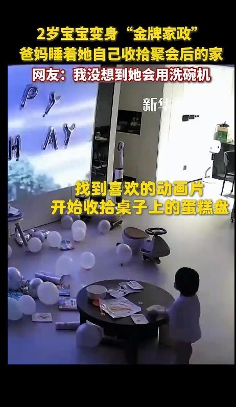 这执行力杠杠的!简直比成年人还勤快、还自律。男子的生日到了,妻子特意给他举办了一场生日聚会,聚会结束后,整个屋子弄得一片狼藉。 可能是玩得太累了,妻子说:“今天就这样吧?明天再收拾吧!” 宝宝却说:“我来收拾吧!” 妈妈知道孩子很会干家务,但是孩子太小了,害怕孩子弄伤自己了,就严肃地对孩子说:“我警告你,你不准动啊!” 你以为宝宝听你的吗?表面上答应了,其实,宝宝把妈妈的话当成了耳旁风。 只见宝宝等爸爸妈妈睡着了之后自己就起来干活了。 宝宝先是走到客厅站在椅子上打开灯,打开了空调,然后就开始做家务了。 首先,宝宝先是收盘子,擦桌子把收好的盘子放到洗碗机里。盘子里的剩菜放入垃圾桶里。 接着,宝宝把沙发推到墙边,打开投影仪。找到自己喜欢的动画片,开始收拾桌子上的蛋糕盘。然后又开始收拾气球,将气球搬到一边。 最后,给垃圾桶套上垃圾袋,就开始着手用吸尘器吸地。吸完地后,再看一眼洗碗机有没有洗好餐具,洗好了,这才回到卧室跟爸爸妈妈一起睡觉。 睡觉之前,还知道亲一亲爸爸妈妈,然后,紧贴在爸爸的身边就进入了梦想。 你看宝宝的动作,一气呵成,动作麻利,一个多余的动作都没有这一看就是老手,你要知道她是一个2岁的宝宝呀! 跟她一样大的宝宝,还什么都不会做呢?只会吃奶呢?她都已经学会做家务了,真的是一个动手能力很强的宝宝。 网友看到后评论说,这样的孩子行动力强,有责任和担当,从不斤斤计较,有爱心,能做事能成事,未来会是社会真正的主人翁。 还有的网友说,这个宝宝的生活状态绝对是幸福满满,懂得感恩,知恩图报。将来一定也会幸福下去的! 话说你们家的宝宝2岁时,正在做什么呢?有没有这么勤快且干活麻溜的宝宝呢?欢迎大家评论区讨论留言。