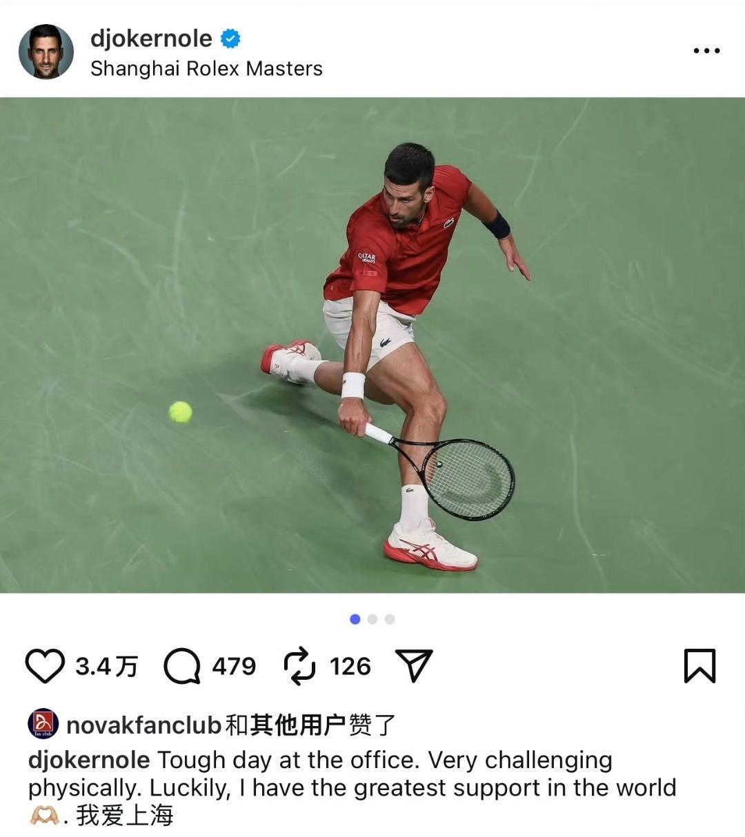 德约科维奇晋级上海网球大师赛8强后通过社交媒体发文感谢了中国球迷:我有世界上最棒的支持! 24届大满贯冠军得主、塞尔维亚网球巨星德约科维奇击败西班牙球员穆纳尔晋级上海网球大师赛8强后通过社交媒体发文感谢了中国球迷对他的大力支持。 德约科维奇发文说道今天我比赛完之后非常累所以没有接受主持人采访就直接离开现场,向中国球迷说声抱歉。今天的比赛对我来说非常艰难和煎熬,我遇到了很大挑战,幸好有你们的鼓励和支持让我坚持了下来赢得了比赛。我想对中国球迷说我有世界上最棒的支持,感谢你们所有人!随后德约科维奇用中文写到:我爱上海! 这场比赛对于德约科维奇来说确实不容易,已经38岁的他在高温湿热的环境下经历了多次医疗暂停才艰难拿下了比赛真是令人敬佩,但愿德约科维奇的身体没有大碍,因为很多中国球迷都想见证今年他在上海大师赛再次获得冠军! #上海网球公开赛# #德约科维奇# #网球# #网坛风云# #ATP1000#