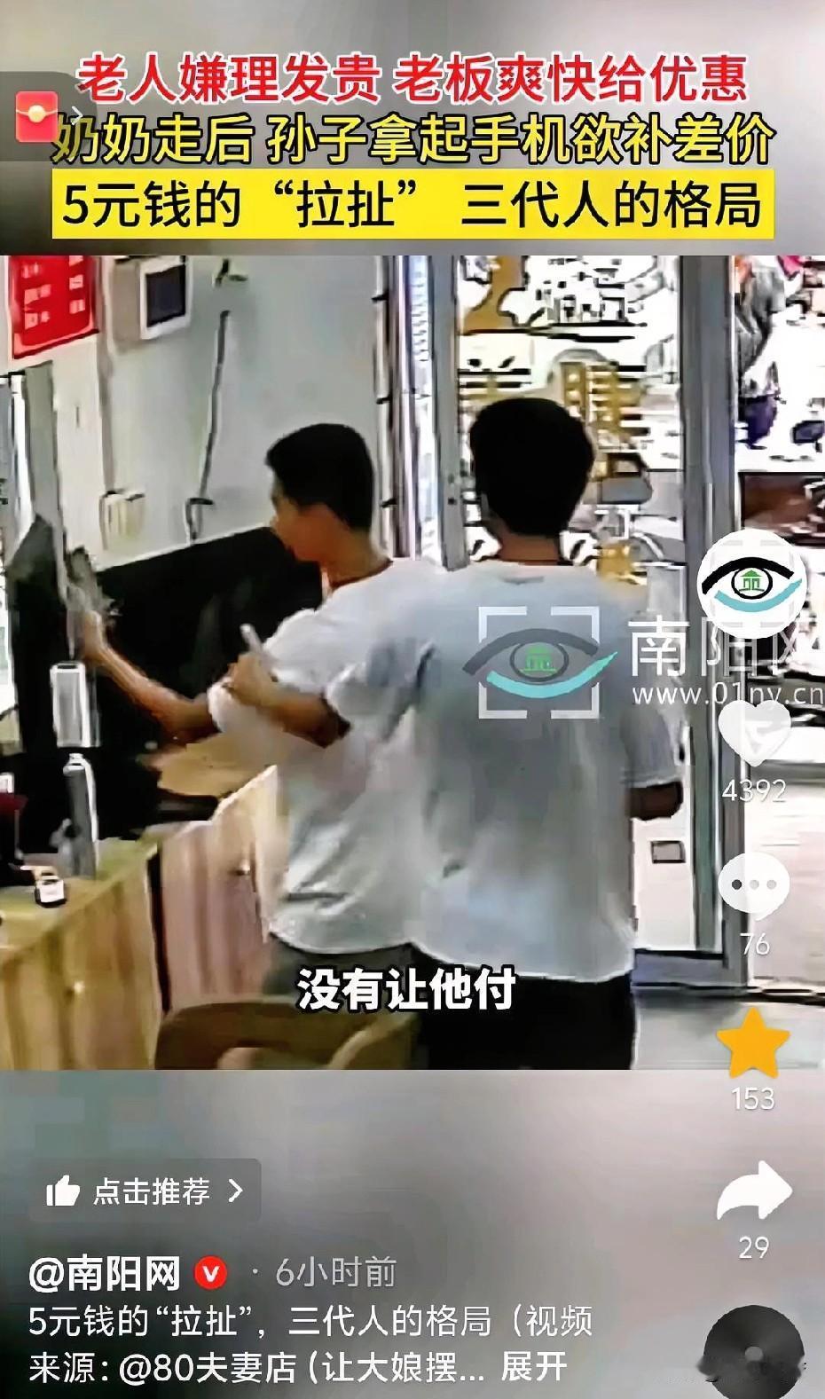 10月3日,浙江诸暨,一名老奶奶领着孙子去理发,问老板理发多少钱?老板回答说,20一位,那里是价格表。老奶奶犹豫了一下,可能嫌价格有点贵,便打算离开。 老板爽快地解释说,来都来了,收你15块钱吧!老奶奶点了点头,随后掏出一张20元的纸币递给老板。老板找了5块钱给她。老奶奶叮嘱孙子,她先去买菜,理完了再去找她。 很快理完了,男孩掏出手机寻找付款码,老板连忙阻止他。小男孩解释说,奶奶只付了15元,还差你5块钱。老板听了男孩的话心里暖暖的,说刚才跟你奶奶说好了,就不用付了。 小男孩还是坚持自己的做法,打算付完钱再走。老板拉着男孩的手,始终没让他付,小男孩才道了谢悻悻离开了。老板表示,小男孩三观很正,不贪图小便宜,也很体谅人。 看了视频,感觉挺暖心的。其实,这就是善良撞着善良了:一方想为孙子多省点,一方想着为老人多让点,俩人为着15块钱的理发费,都透着股子实在劲儿。 老奶奶讨价还价是老一辈过日子的习惯,不是小气,就是觉得能省一点是一点,而老板一口应承,也是体谅老人带娃不易,没把几块钱看得太重。 更让人动容的是小男孩,明明奶奶已经付过钱,他却惦记着还差5块,哪怕老板说了不用给,还是坚持要补。这孩子心里跟明镜似的,知道该给的钱不能少,这份不占便宜、守着本分的模样,比任何大道理得管用。他可能不懂得什么是“诚信”,但用行动把“该给的钱就得给”这件事做得明明白白。 这件事没有轰轰烈烈的情节,却像冬日里的一缕暖阳。老板让一步,是体谅;男孩补钱,是本分,都是小日子里的微光。 当善良遇见善良,没有谁吃亏,反而让人与人之间的距离更近,也让我们明白,真诚待人、相互体谅,就是生活最动人的模样。(来源:南阳网)