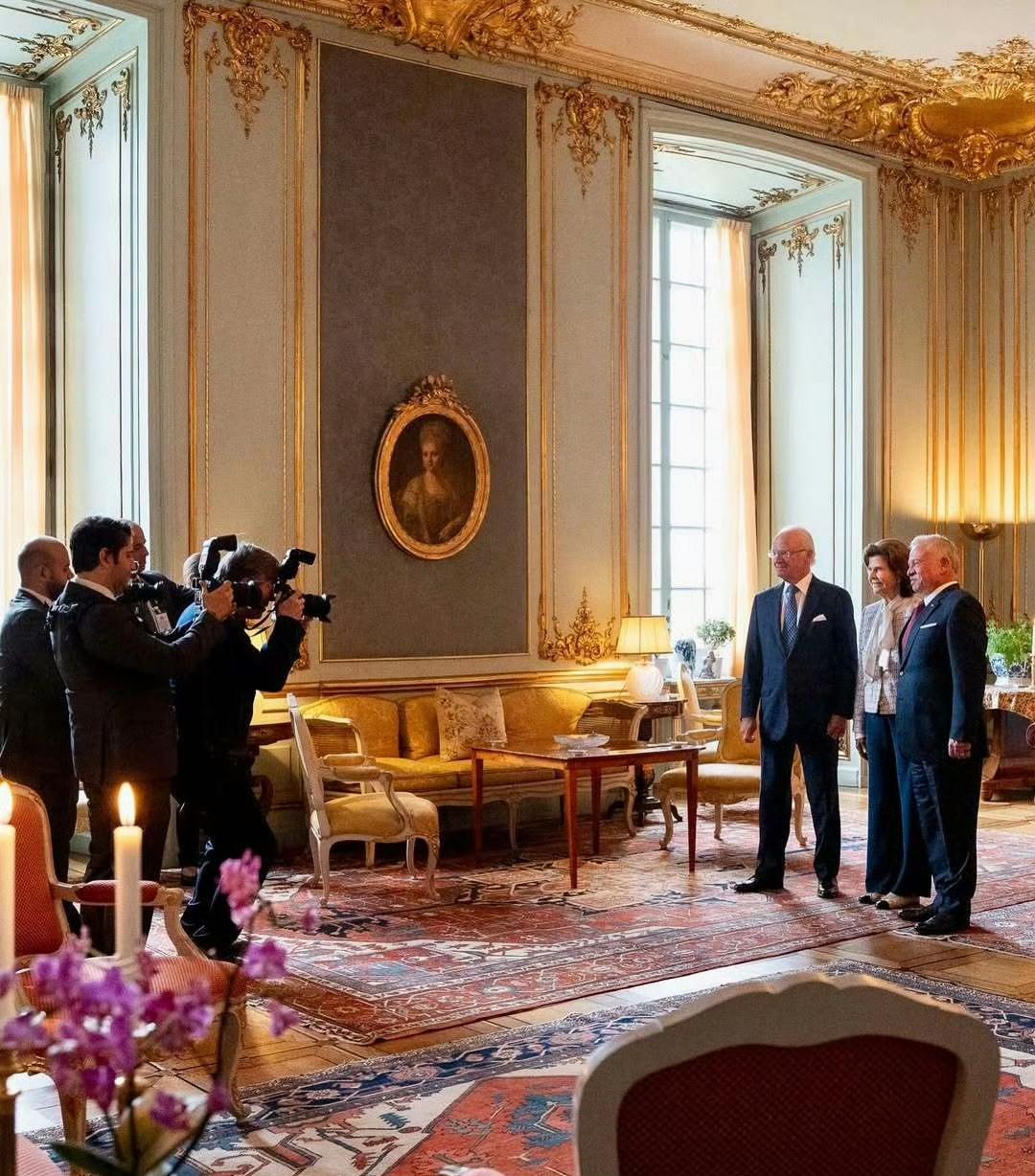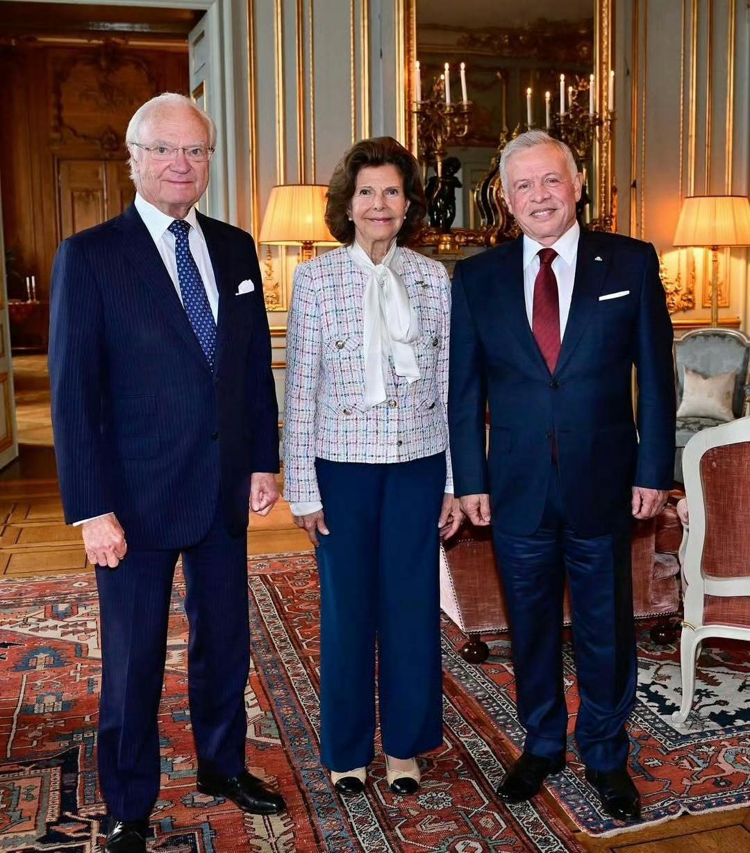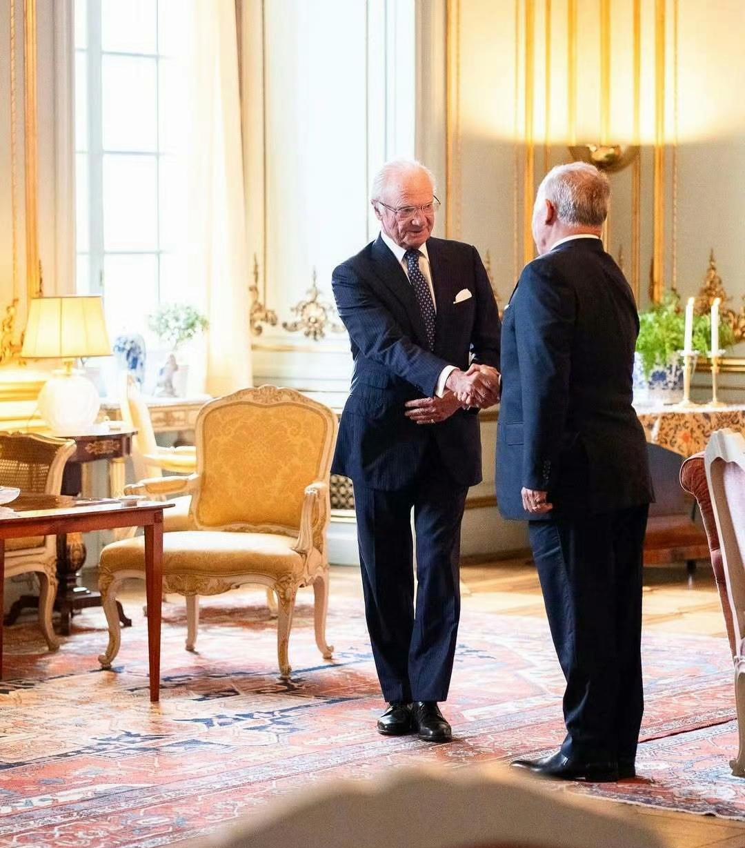 10月7日,瑞典卡尔十六世·古斯塔夫国王和西尔维亚王后在卓宁霍姆宫会见约旦国王阿卜杜拉二世。