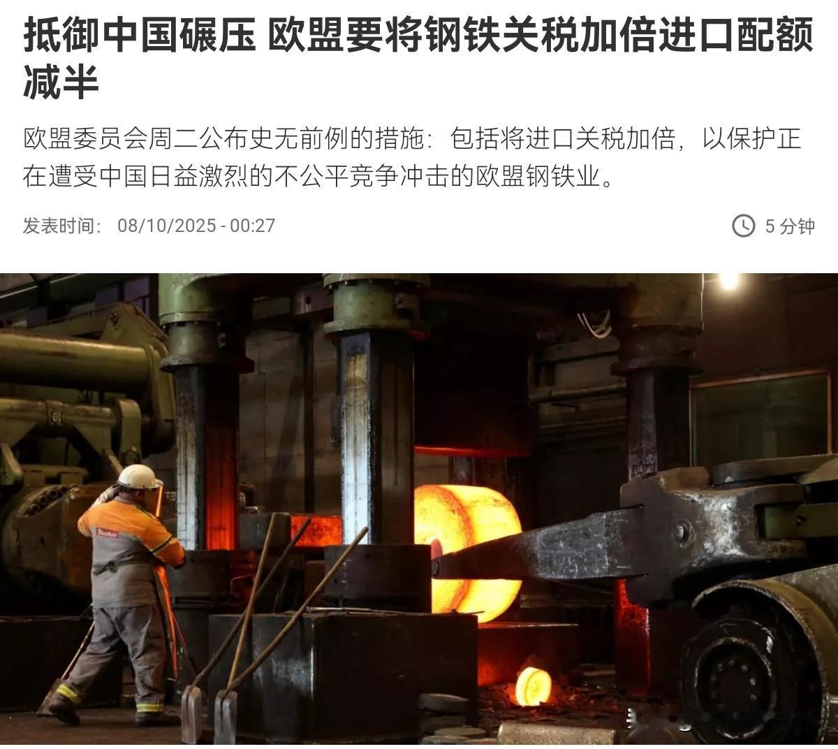 欧盟这是完全讨打的行为,我们肯定不会惯着!10月8日,根据法新社报道,欧盟突然对我们出手了。欧盟委员会公布史无前例的措施,包括将进口关税加倍,以保护正在遭受中国日益激烈的“不公平竞争”冲击的欧盟钢铁业。不仅如此,欧盟还宣布,将每年可免税进口到欧盟的外国钢铁配额减少47%。 也就是说,免税配额钢铁将减少至 1830 万吨。欧盟委员会副主席塞若表示:欧洲钢铁行业正处于崩溃的边缘。我们将保护它,以便它能够投资、脱碳,从而重新恢复竞争力。法媒表示,中国被指维持产能过剩,压低全球价格,结果导致许多欧洲钢铁厂关闭。 很显然,明明是欧洲企业自身竞争力不足,欧盟却搬弄是非,给我们扣一个“不公平竞争”的帽子,妄图设置贸易壁垒,以保护欧洲的产业。我们倒是想问的是一贯标榜自由贸易的欧洲,这个时候怎么不讲自由贸易了呢?欧洲不是一再的表示要遵守以规则为基础的国际秩序吗?欧洲的规则难道就是越发的紧闭市场的大门,实施贸易保护主义吗? 欧洲的所作所为,这不是典型的说一套做一套的双标嘴脸吗?竞争不过我们,就把自己标榜的东西仍在一边,这无疑是非常的虚伪。当然,欧盟这样做,这必然是会有后果的。我们肯定也会出手,捍卫自身利益。欧洲这是讨打的行为,我们不会惯着,也不能惯着。