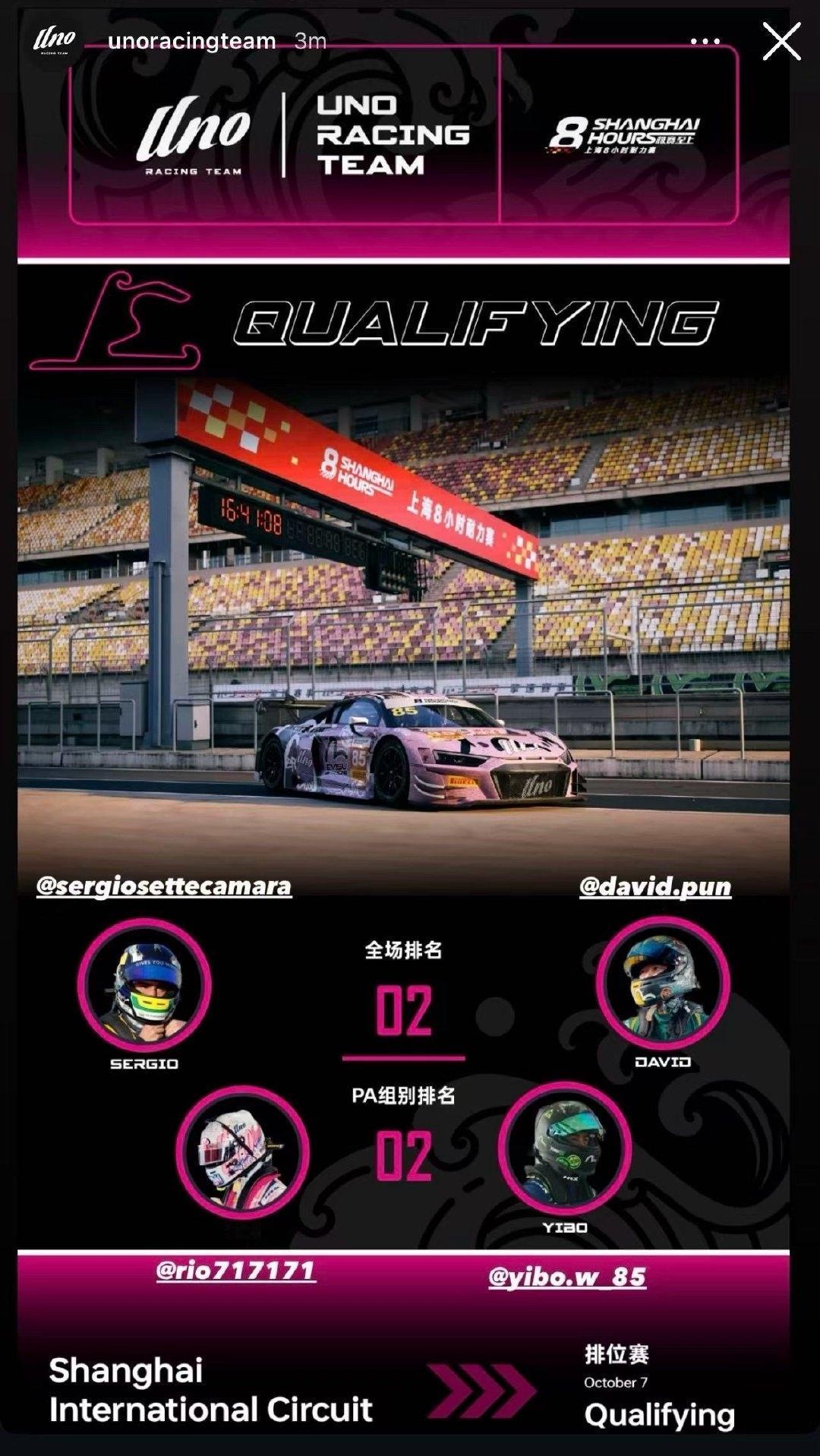 上海8小时耐力赛第一天排位赛,王一博与队友共同组成的85号车组在排位赛中取得全场