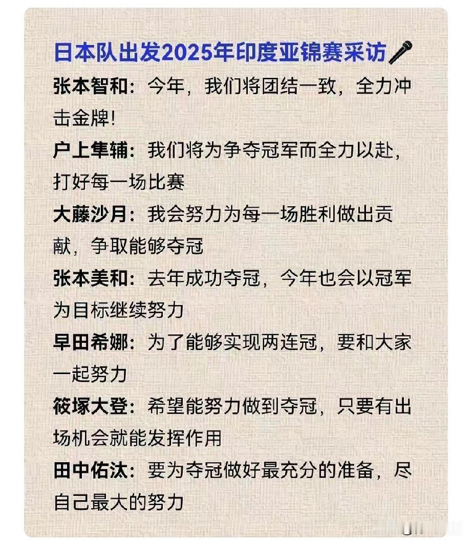 印度亚锦赛,日本海报做早了,居然把桥本帆乃香放在前面了! 看得出他们对桥本的重视, 我觉得这海报是中国大满贯之前做的, 现在大迪也破解了桥本的防守, 桥本已经不行了… 这次不仅是张本智和, 所有队员都高喊冠军! 大概是去年女团输给日本后, 他们是膨胀了吧! 今年国乒的状态和去年不同, 去年莎莎输美和是因为有伤, 今年我对女队还是非常放心的。 最后还是那句话, 印度亚锦赛, 只求安全归来, 不求成绩!