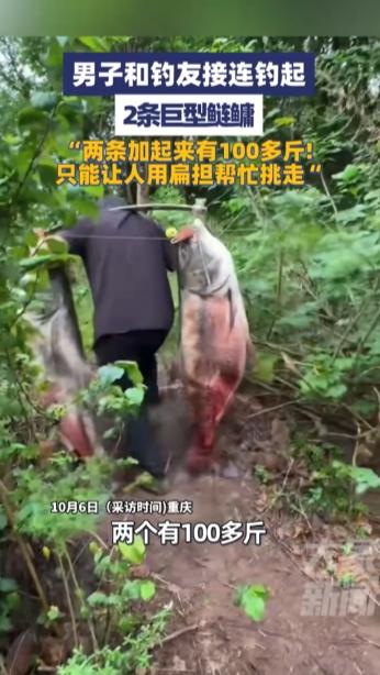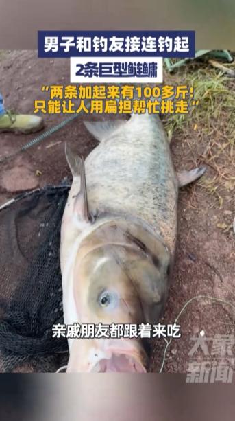 “简直赚翻了!”10月6日,重庆,一男子和钓友接连钓起两条巨型鲢鳙,加起来足足有100多斤,狂赚上千元,由于鱼太大太重,男子只能找人来用扁担将两条大鱼帮忙挑回家,网友:这能吹上好几年了! 不少人把钓鱼视当成自己的兴趣爱好,休息时总会带着钓鱼装备来到湖边,一坐就是一下午,要是能钓上大鱼非得发个朋友圈炫耀炫耀,不过,想钓上大鱼不仅需要技术和经验,还需要一点运气。 一男子假期闲来无事,喊上自己的钓友一起去钓鱼,他们来到一处水库边支起自己的装备,将鱼钩一端抛入水中,等待鱼儿上钩。 不一会儿,男子发现自己的浮漂在猛烈震动,他赶忙站起身来将鱼往岸边拉,这显然是个大家伙,巨大的拉力让鱼竿迅速弯折,男子怕竿脱手,铆足了劲紧紧抓住。 经过一番博弈,大鱼终于被拉到了岸边,男子拿起一旁的抄网准备捞起来,他一看网中的鱼顿时喜笑颜开,眼前是一条巨型鲢鳙,将鱼拎起来足有半人高。 随后一旁的钓友也钓上了一条差不多大小的鲢鳙,两条鱼加在一起大约有个100斤,这要是放在市场卖绝对能卖个上千元了。 这两条鱼太大太重,男子很难把它们运回家,无奈之下,他只好喊人拿了个扁担帮忙挑走,一回家男子就将鱼丢进了锅里,喊来了亲朋好友一起品尝这条巨鱼。 不少网友羡慕男子的运气,纷纷询问在哪里钓的,不得不说,这鱼看起来确实很壮观,钓上这大鱼,估计够男子吹上好几年了! 信息来源:《男子和钓友接连钓起2条巨型鲢鳙:两条加起来有100多斤!只能让人用扁担帮忙挑走》大象新闻