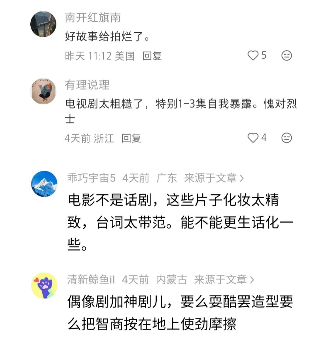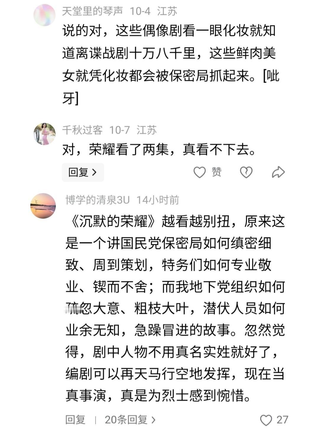 《沉默的荣耀》:好故事给拍烂了。 我看近期出来的电视剧《沉默的荣耀》,网上网民点赞的多,批评的也不少。 批评的网友们总的看法是:好故事给拍烂了。 如这位说:这些偶像剧看一眼化妆,就知道离谍战剧十万八千里,这些鲜肉美女就凭化妆都会被保密局抓起来。 如这位讲:偶像剧加神剧儿,要么耍酷摆造型,要么把智商按在地上使劲摩擦。 如这位评论:《沉默的荣耀》越看越别扭,原来这是一个讲国民党保密局如何缜密细致、周到策划,特务们如何专业敬业、锲而不舍;而我地下党组织如何疏忽大意、粗枝大叶,潜伏人员如何业余无知,急躁冒进的故事。 如这位说:荣耀看了两集,真看不下去。 如这位指出:电视剧太粗糙了。愧对烈士。 各位有啥看法?@真业心学创始人东方赢 欢迎评论。