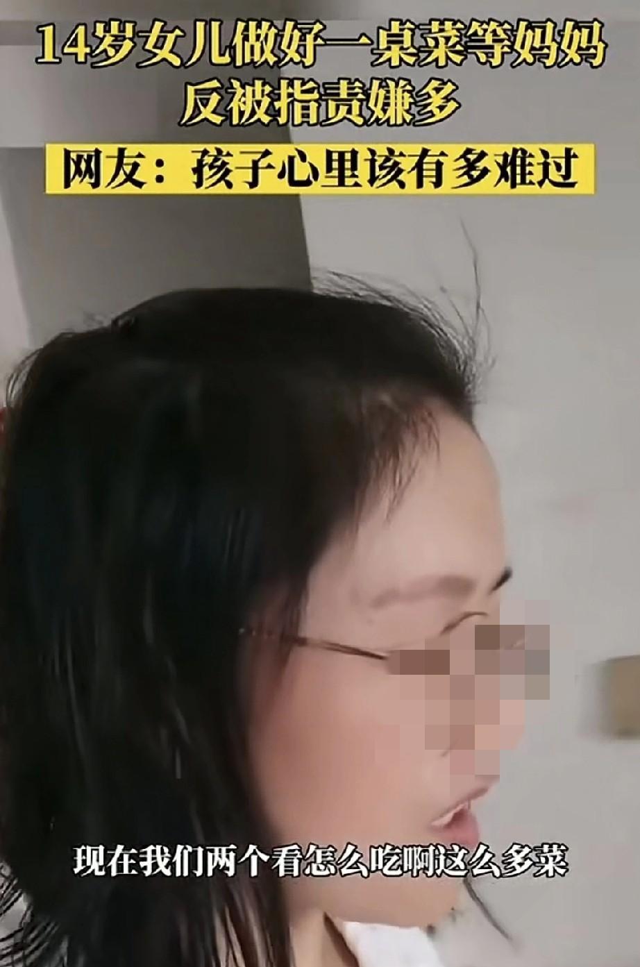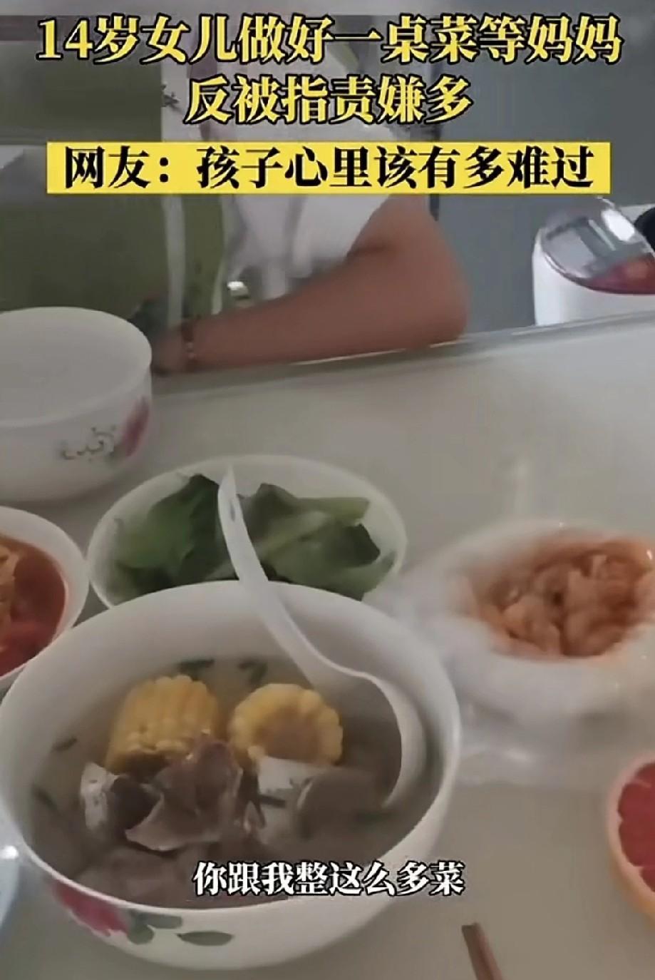 14岁的女儿做了一桌菜等着妈妈回来。妈妈回来后却指责女儿,嫌菜太多,质疑中午怎么