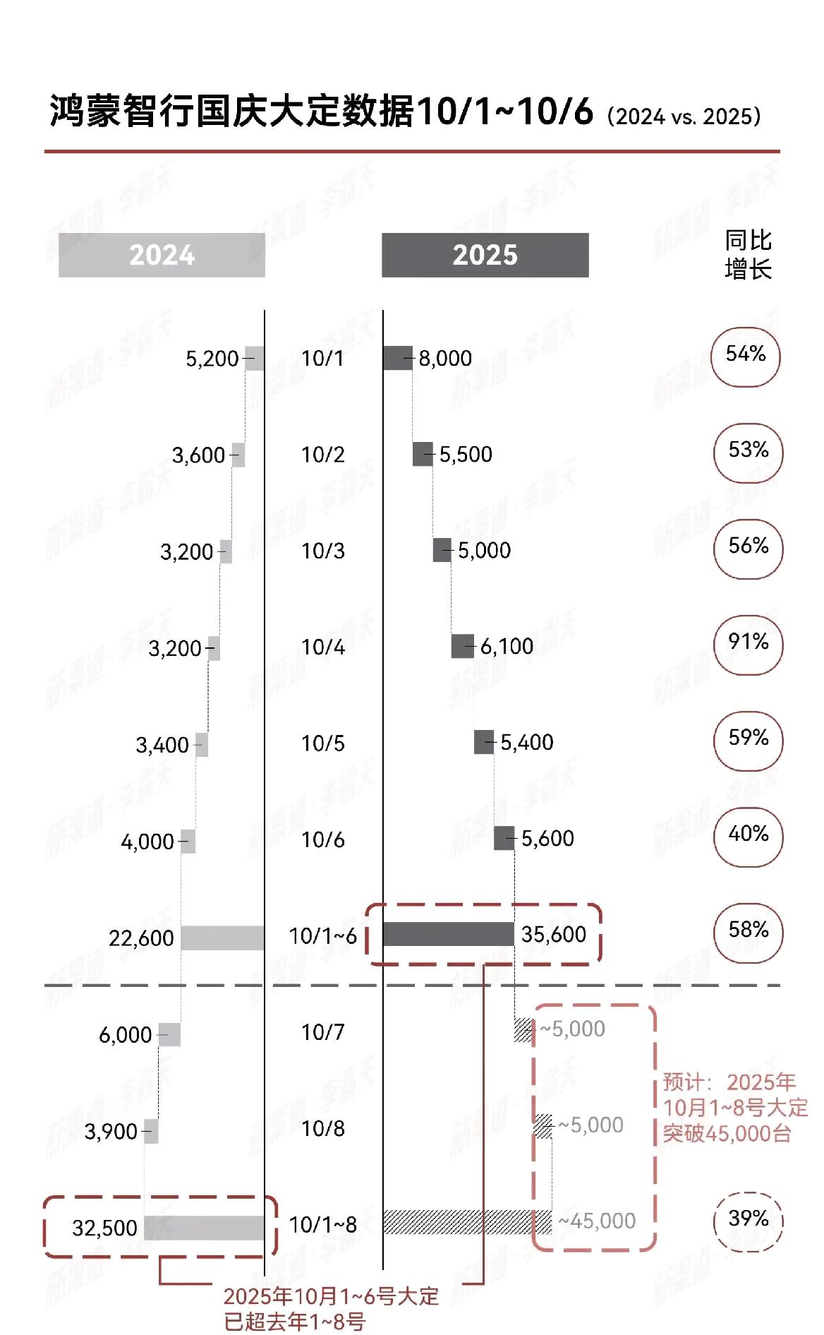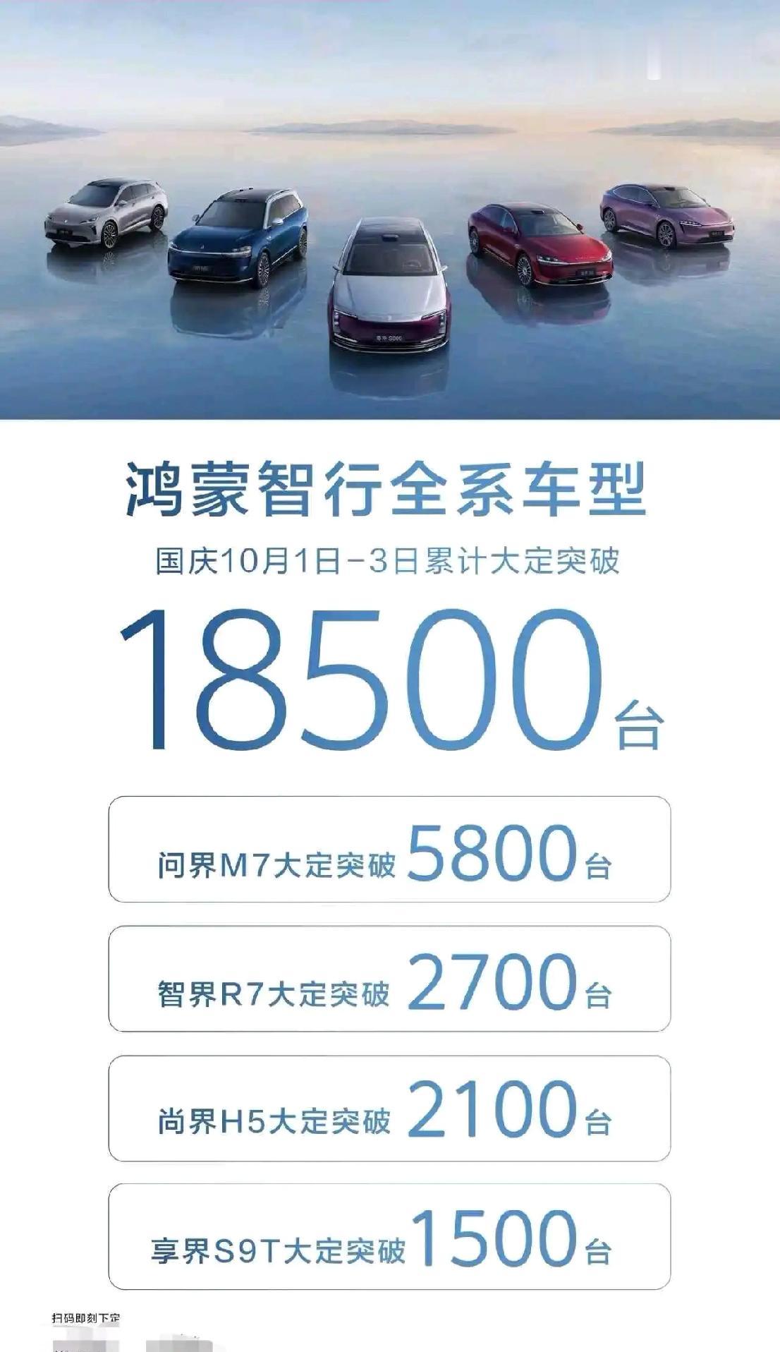 鸿蒙智行国庆假期大定汇总。 对比去年国庆,大定同比增长超过50%,从鸿蒙智行官方公布的战报来看,智界R7大定略小于问界M7的一半,这么看智界R7稳定期月销过万问题不大。
