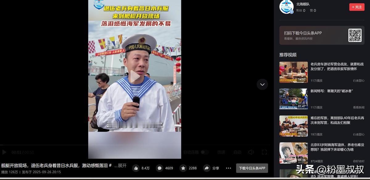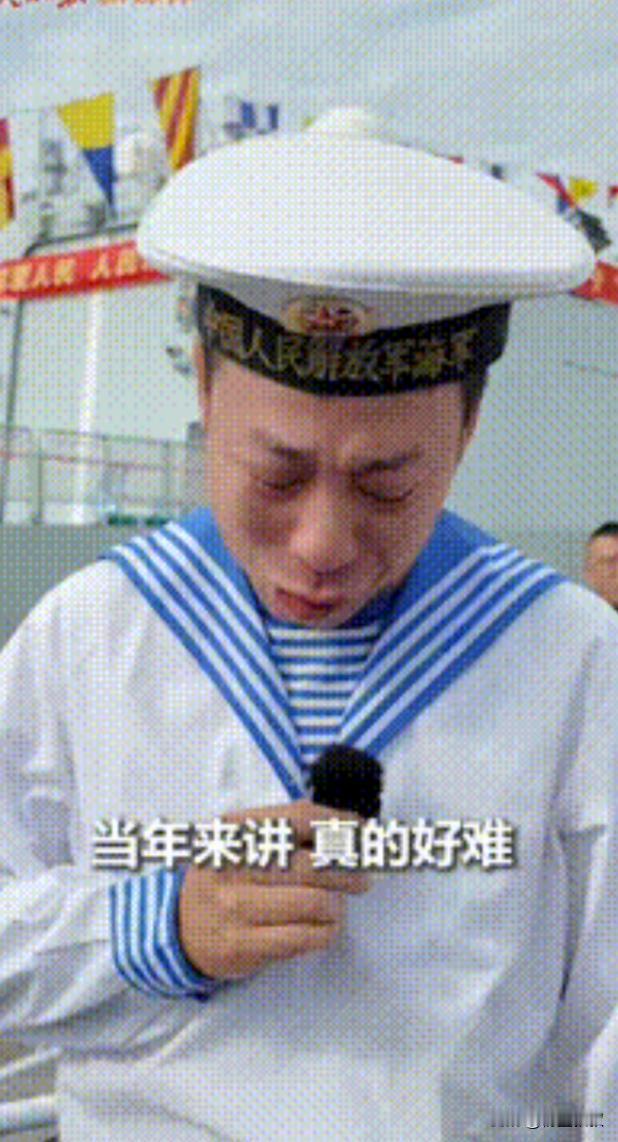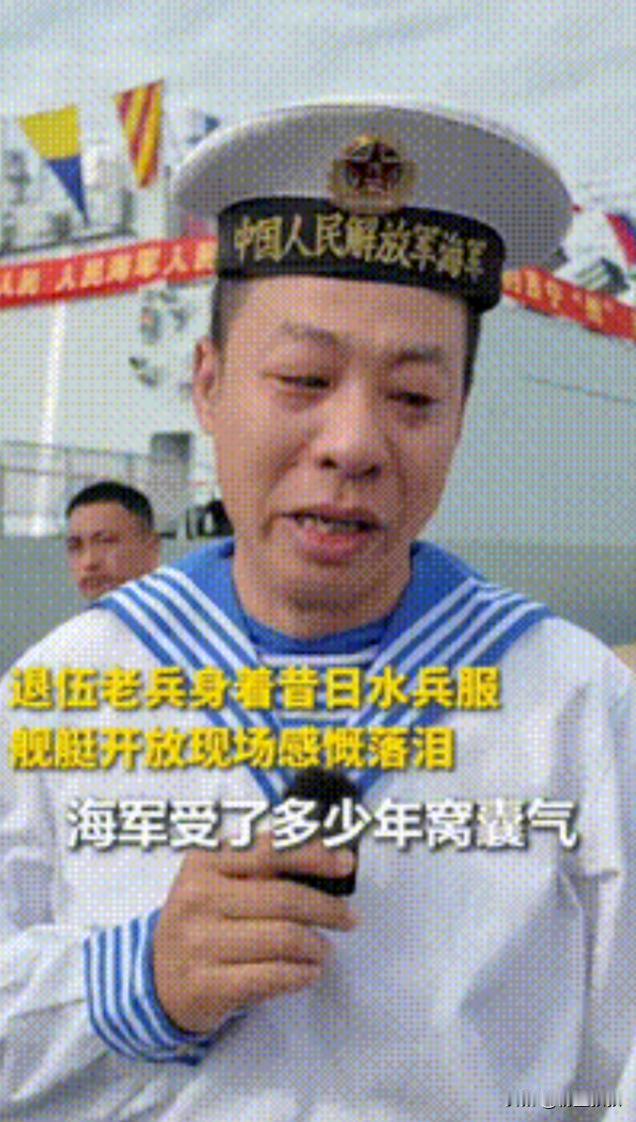 “真的哭死!”,在舰艇开放现场有一位穿着老版水手服的男子,本以为是角色扮演为了拍出好看照片,没想到他竟是一位多年前的海军老兵。 九月青岛奥帆中心的风,还带着点海的凉劲儿,西宁舰和芜湖舰就停在码头,钢铁舰身亮闪闪的,引了好多人围着看,人群里有个身影特别扎眼,不是因为多花哨,是他穿的那件水手服看着也太旧了。 衣服洗得发了白,紧紧贴在身上,袖口磨得都起了毛边,领口那个锚形的徽章,氧化得发黑,一点光泽都没有,周围的年轻人都小声议论,“这 cosplay 挺用心啊,道具都特意做旧了,就为了拍几张好看的照片吧?” 大家你一言我一语,眼神里都是好奇,没谁真把这衣服和 “真海军” 联系到一起。 直到他走到芜湖舰的舷梯边,没急着往上走而是慢慢伸出手,轻轻碰到舰身那冰凉的钢板,就这一下他突然停住了脚步,刚才还挺平稳的手,开始轻轻发抖眼泪没打招呼就往下掉,一滴接一滴砸在甲板上,顺着缝隙往下渗。 周围刚才还叽叽喳喳的,一下子就静了,刚才说 “cosplay” 的几个年轻人也都闭了嘴,眼神里从好奇变成了惊讶,这时候才有人反应过来,那不是什么刻意做旧的道具服,衣服上的磨痕是常年穿出来的,徽章的氧化是时间浸出来的,连他发抖的手、止不住的眼泪,都真得没法演,这人是真的和这军舰、和这大海有故事。 后来才知道他姓伍,是二十多年前的海军老兵,1999 年就入伍了,在临汾舰待了整整十二年,提起当年在船上的日子,全是现在年轻人想象不到的苦,那时候他们出海,每人就发一个 25 升的塑料桶,里面装的就是全部淡水。 洗脸只敢用湿毛巾擦两把,刷牙也得省着水,连喝的水都要算计着来,不是他们不爱干净,是省下来的水,能腾出货舱的空间,给军舰多装几吨燃油,就为了让续航时间能再长一点,能在海上多待一会儿。 更让人心里发紧的,是他说的 96 年那阵儿,那时候面对强敌,咱们的装备跟不上,没别的办法,只能把陆军的榴弹炮拆下来,用粗钢索硬生生绑在民船的甲板上。 现在听着跟开玩笑似的,可那时候这就是咱们能拿得出手的、射程差不多 30 公里的对陆打击法子,那种因为装备落后心里没底的无奈,他到现在想起来都觉得堵得慌。 这次能登上新军舰,他本来只是想看看,可一踏上甲板,看到满舰的现代化装备,眼泪就控制不住了,现在的军舰,24 小时有热水,全舰都装了空调,每个舱室还有独立卫生间,哪还用像当年那样算计着用水? 他摸着舰上的相控阵雷达,指尖划过垂直发射系统的外壳,嘴里就反复念叨 “强多了,真的强多了”,声音有点发颤,眼泪又忍不住往下掉。 前阵子他在手机上刷到福建舰电磁弹射歼 - 35 的视频,晚上躺在床上抱着手机看了一遍又一遍,哭得像个孩子,他说那时候脑子里全是当年在临汾舰上的日子,一边哭一边想,“咱们海军,终于熬出来了,终于这么强了”。 这事儿后来传到了网上,越来越多人知道了伍老兵的故事,现场的年轻人从最开始的围观,变成了主动凑过去,轻声问能不能合个影。 评论区里,“哪有什么岁月静好,不过是有人曾替我们负重前行” 这句话,被点赞了好几万次,大家这才真的懂了,他身上那件褪色的旧水手服,不是一件普通的衣服,是咱们国家海军从窘迫到强大,一步一个脚印走过来的见证,上面的每一道磨痕,都记着当年的难,每一处褪色都映着现在的强。 参观结束的时候伍老兵站在码头,盯着军舰看了好久都不愿走,风把他的衣角吹得飘起来,他就那么站着,好像在跟当年的自己、当年的军舰告别,他的青春早就跟那片海、那艘老舰融在了一起,而这件旧水手服,也像是完成了它的使命,变成了一种劲儿,传给了现在的年轻水兵。 (信息来源:北海舰队)