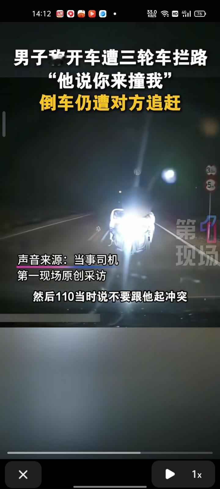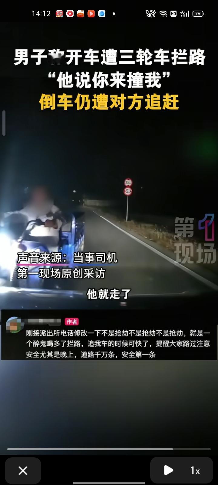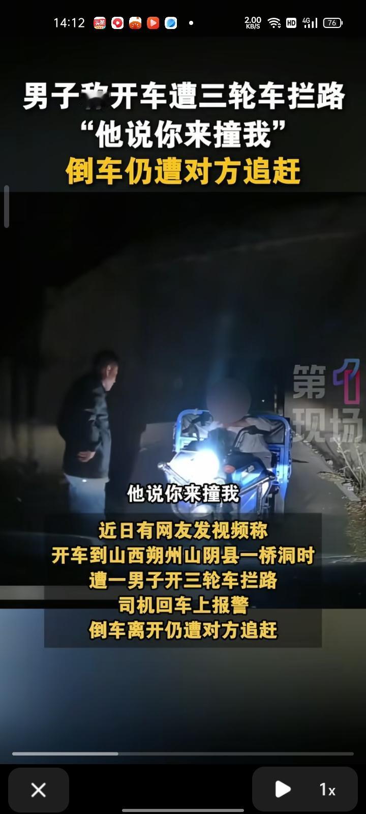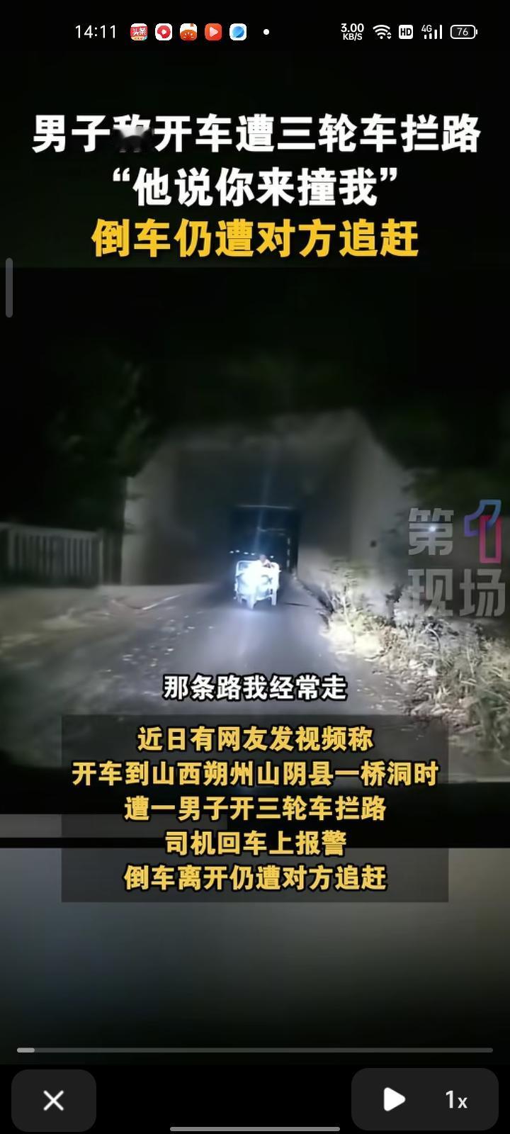 10月3日,朔州市山阴县。网友发视频称,自己开车路过桥洞时,遭一男子开三轮车拦路,司机回车上报警,倒车离开仍遭对方追赶。当事司机称,当时下车理论对方说“你来撞我”,自己就赶回车里报警了,后续警方回复称“不是抢劫,醉鬼喝多了拦路”。发视频的目的只是希望这种事不要发生。