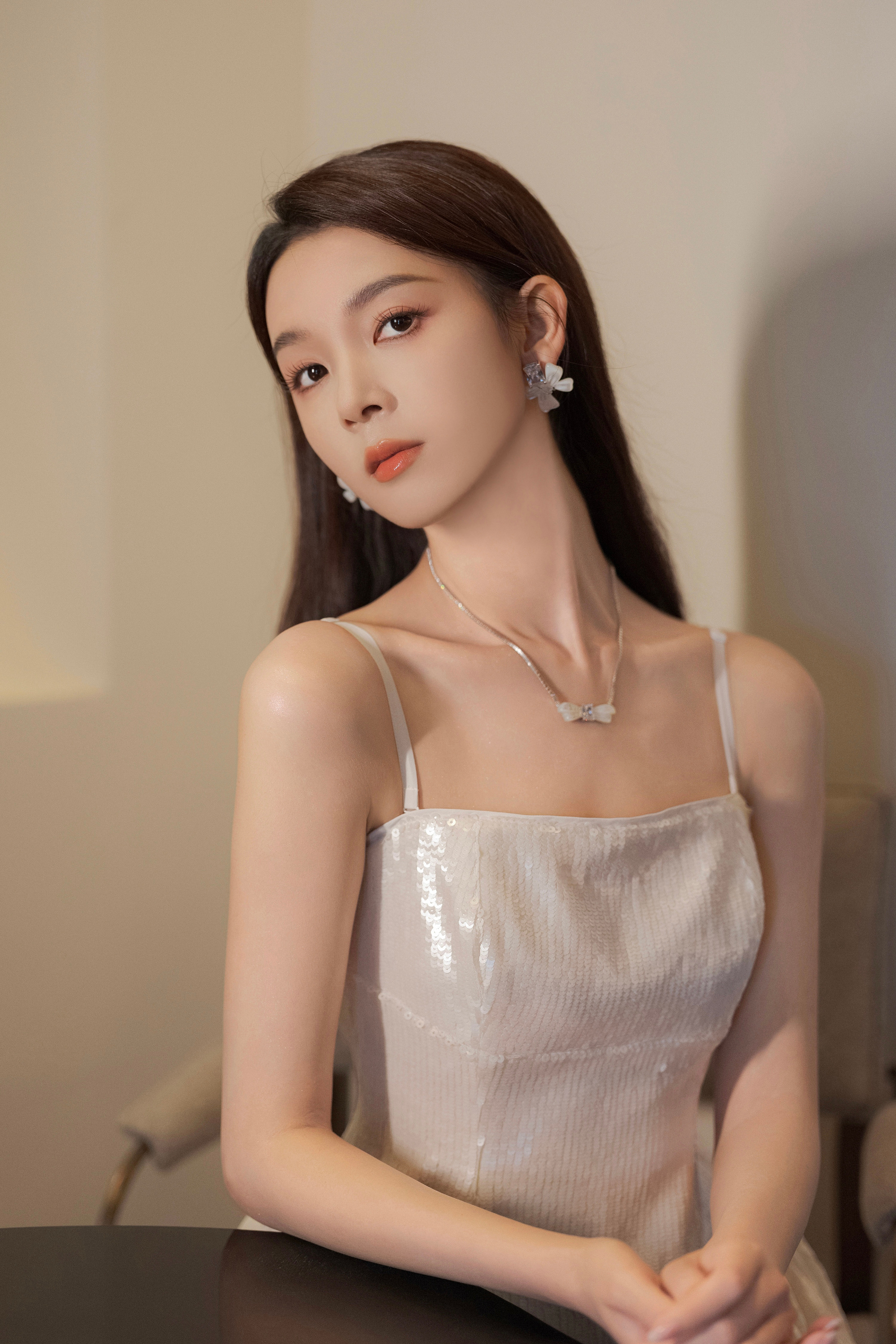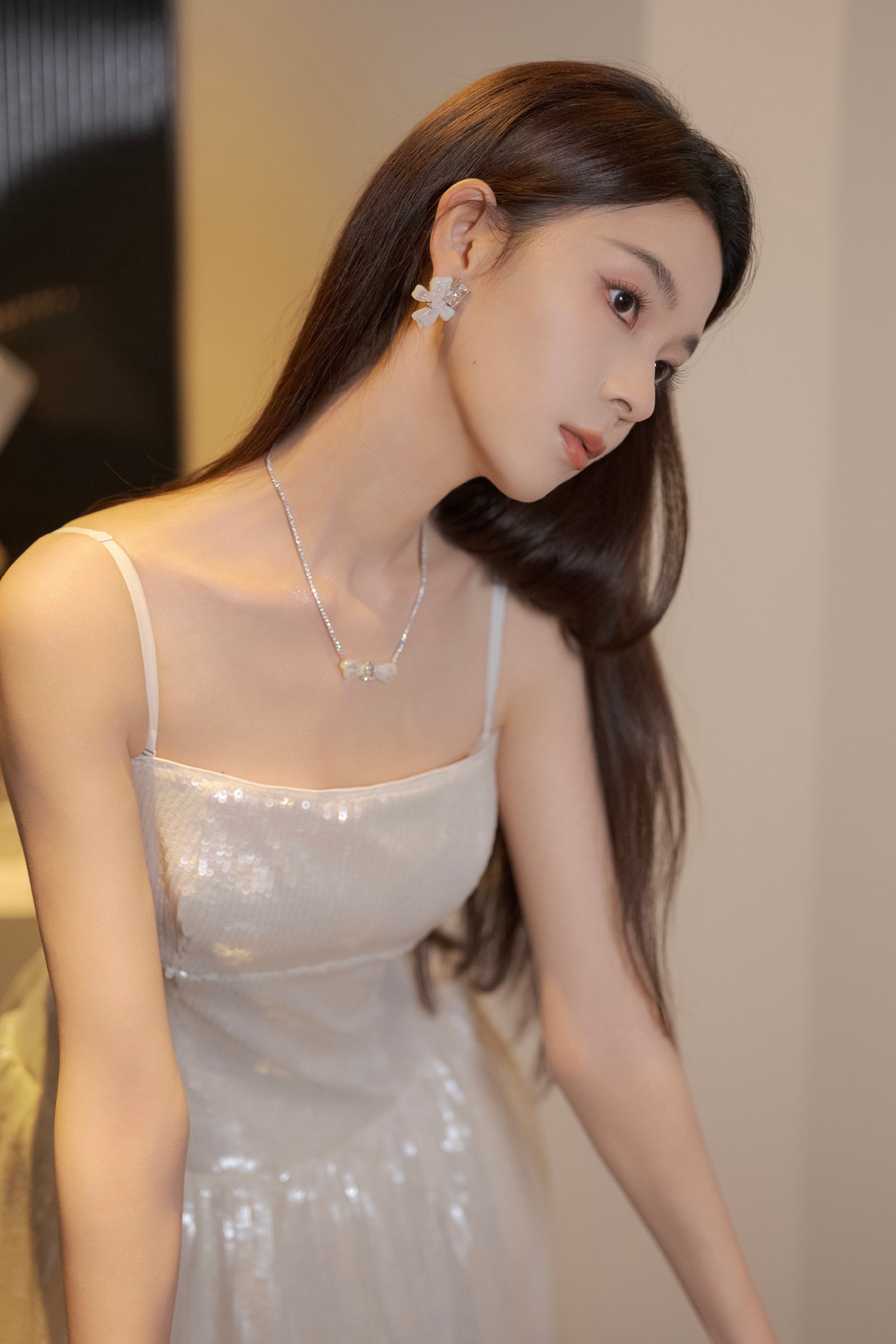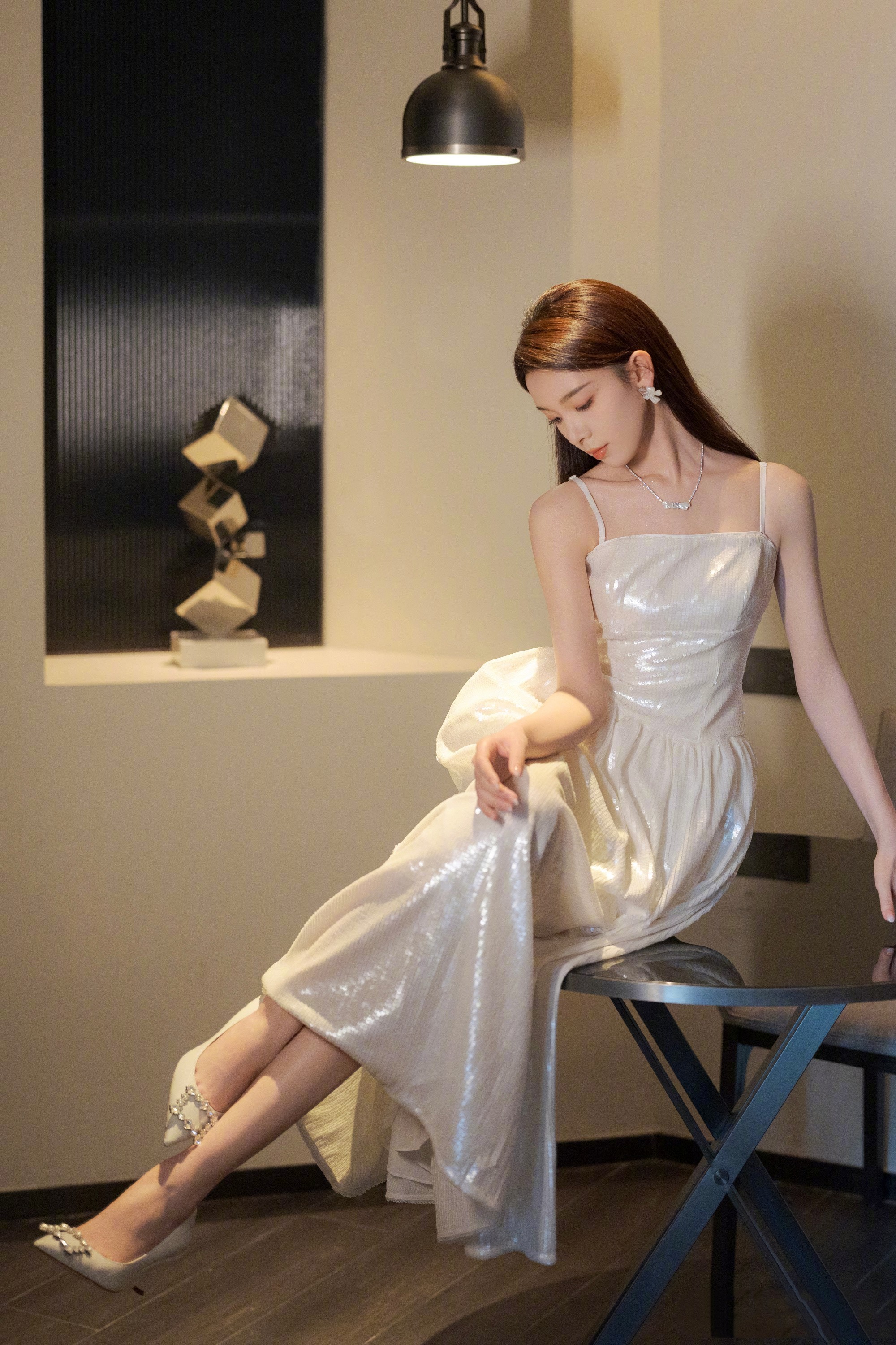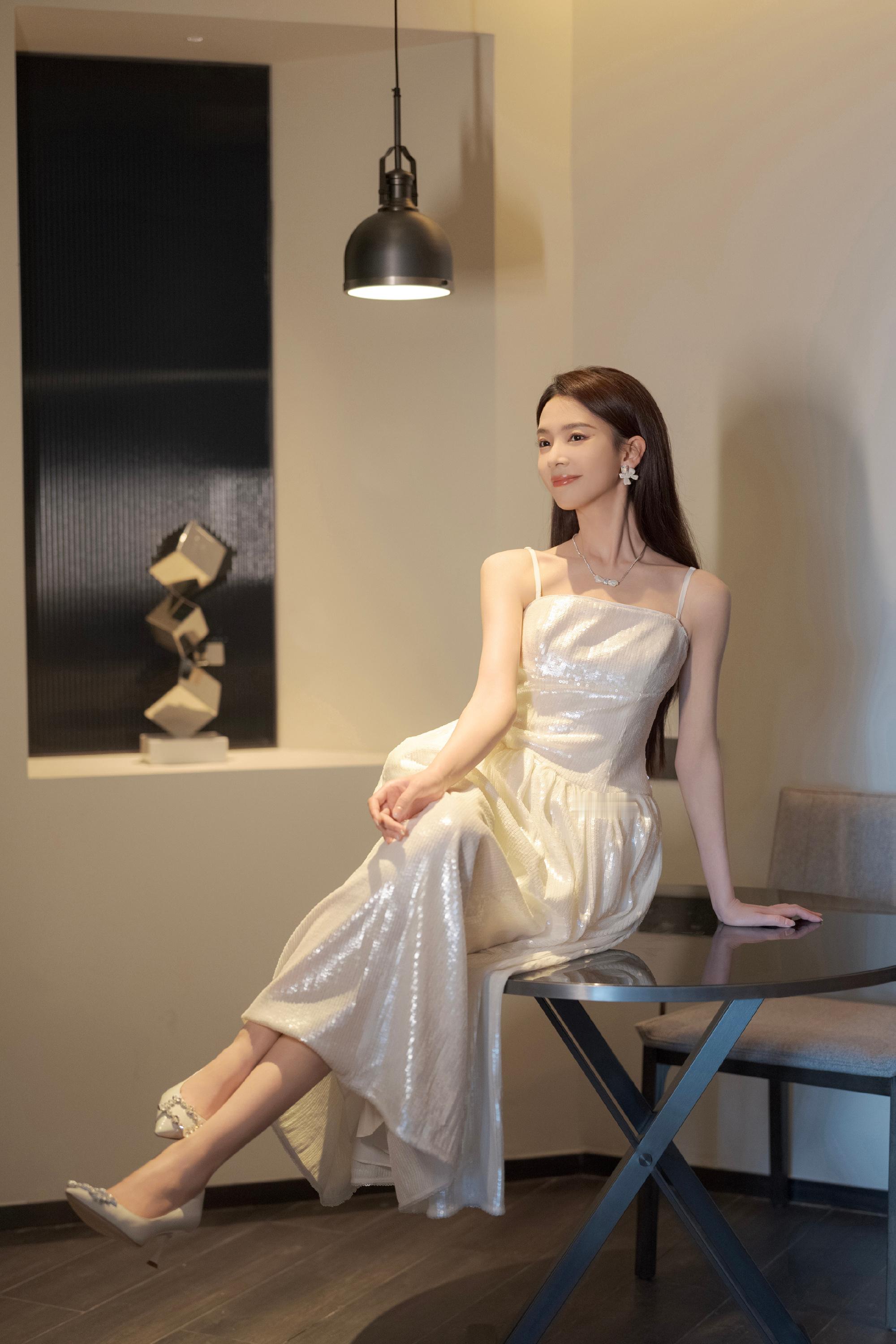 陈瑶,银色吊带长裙,尽是温柔静谧姿态。陈瑶身着银色吊带长裙,如月光倾洒,尽显温柔静谧之姿,文艺清新中蕴含着深邃韵味,一瞥一笑皆是诗行。