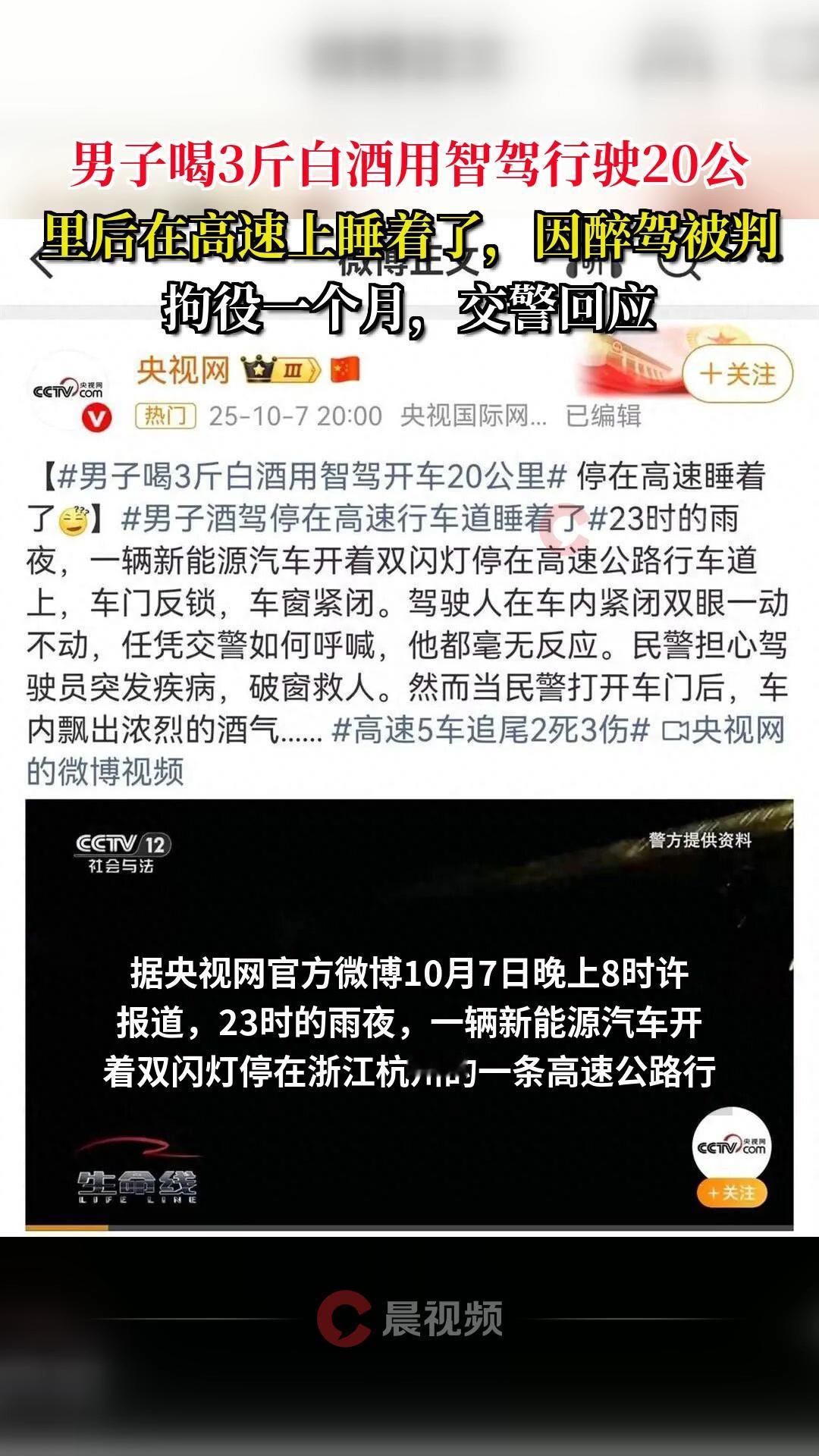 10月7日,央视网报道了一件荒唐事。33岁的姜某连续赶了两场酒局,整整喝下约3斤白酒,之后竟妄图依靠新买车辆的智驾功能,从淳安前往建德的岳母家。他自以为,设置好自动驾驶,就算被查,也能狡辩自己没开车。 结果,他行驶了20公里后,在G4012高速杭州方向淡竹收费站附近睡着了,车双闪着停在行车道上,车门反锁、车窗紧闭。交警还以为他发病了,破窗实施救援,一打开车门,浓烈的酒气扑鼻而来。此事迅速冲上热搜第一。只能说,酒驾本就是违法行为,还想利用智驾来钻空子,这简直是把生命和法律当作儿戏! 醉酒后驾驶 酒后离谱行为 酒后奇葩事件 智驾车祸 酒后智驾 浙江醉驾 智驾翻车