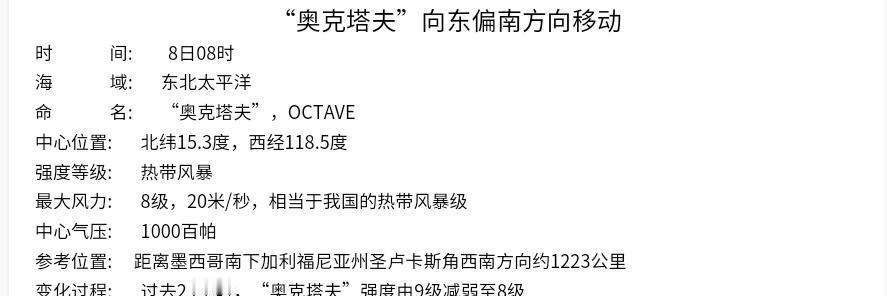 强度持续减弱】北京时间10月8日08时,东北太平洋热带风暴“奥克塔夫”(OCTAVE)的动态监测信息发布,其移动路径与强度均出现新变化。监测显示,“奥克塔夫”中心当前位于北纬15.3度、西经118.5度,距离墨西哥南下加利福尼亚州圣卢卡斯角西南方向约1223公里。该风暴目前强度等级仍为热带风暴,但较前期明显减弱——中心附近最大风力从过去24小时的9级降至8级,风速20米/秒(相当于我国热带风暴级标准),中心气压为1000百帕。东北太平洋热带风暴奥克塔夫 气象部门预报,“奥克塔夫”将以每小时15公里左右的速度向东偏南方向移动,且在移动过程中强度将继续逐渐减弱。建议墨西哥南部沿海及周边海域关注其后续路径,做好海上活动安全防范。