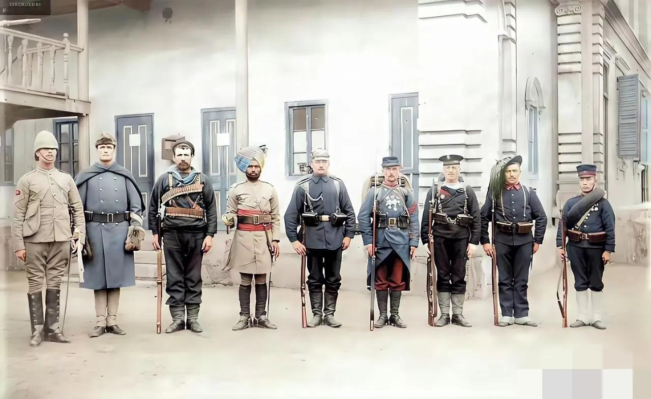 这是当年八国联军攻入北京城后,每个国家派出一名士兵列队,以此展示八国联军统一作战
