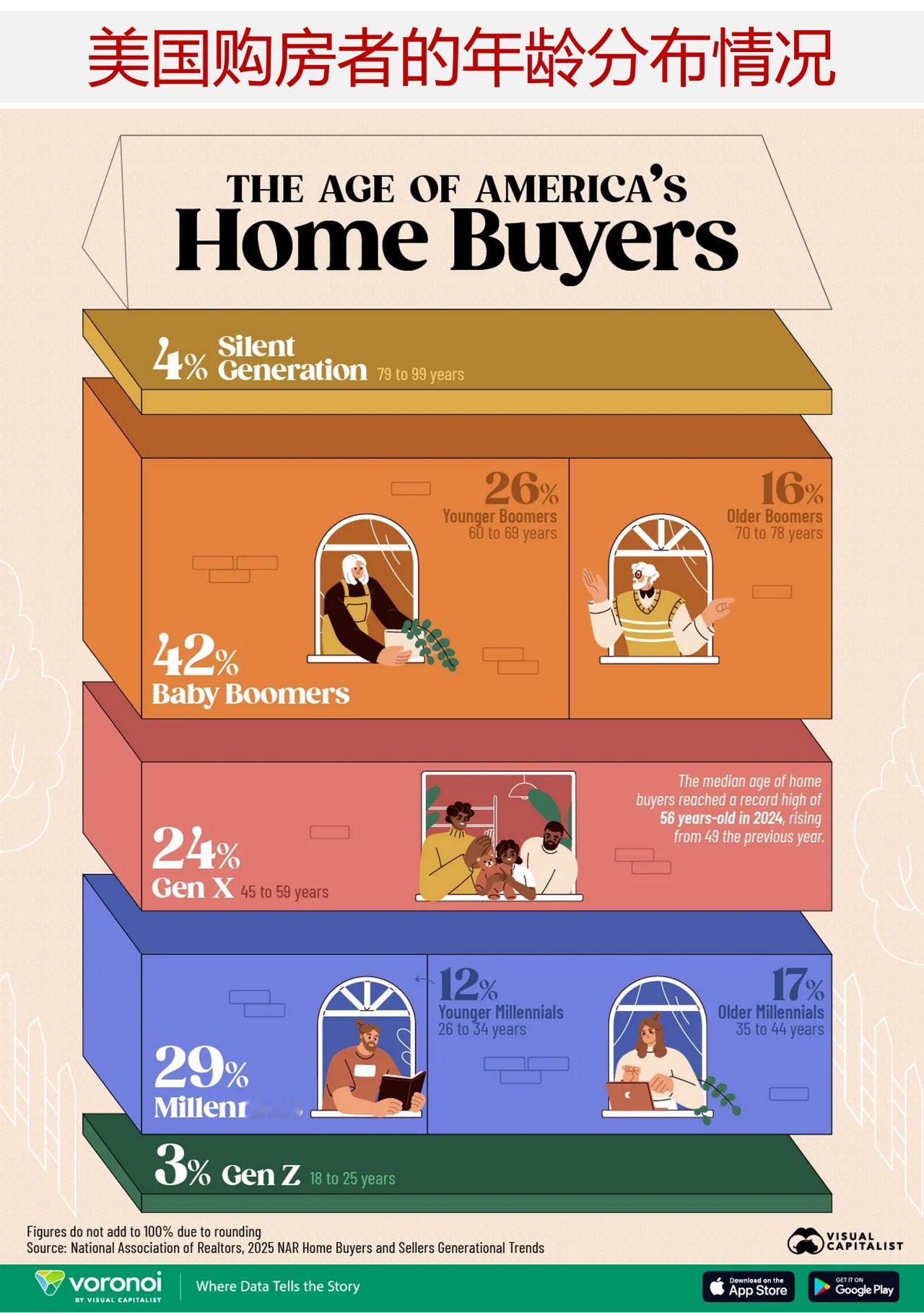 谁在美国房地产市场中占据了主导地位?来看美国各世代购房者情况 近年来,美国购房者的构成发生了显著变化。年长一代,尤其是婴儿潮一代,如今在房地产市场中占据了主导地位。 房价上涨以及房贷利率上升使得年轻人群体更难购房,而年长的购房者通常财务状况更为稳定。 这份图表根据美国全国房地产经纪人协会截至 2025 年 9 月的最新数据,对 2024 年美国的购房者按世代进行了细分。 ——“婴儿潮一代”掌控美国购房市场 “婴儿潮一代”占美国所有购房者的 42%,是所有年龄段中占比最大的一代。较年轻的“婴儿潮一代”(年龄在 60 至 69 岁之间)占 26%,是美国购房者的最大群体,而年龄较大的“婴儿潮一代”(70 至 79 岁)占 16%。 下面的图表按世代细分了 2024 年美国房屋购买量的占比情况,其中“婴儿潮一代”和“千禧一代”又被细分为年龄较大的群体和较年轻的群体。由于取整原因,百分比之和并非为 100%。 婴儿潮一代的主导地位反映了这一群体在经济方面的优势,其中许多人通过数十年来不断上涨的房产价值和股权投资积累了大量财富。 ——美国年轻一代的购房情况 在“婴儿潮一代”之后是“千禧一代”,他们总共占 2024 年美国购房者的 29%。总体而言,千禧一代略领先于年龄较大的“X 一代”,后者在 2024 年占美国购房者的 24%。 然而,如果将千禧一代细分为年轻一代和年长一代,我们就会发现年轻一代在总体购房人群中所占比例相对较小。 如果仅考虑年龄较小的千禧一代和 Z 世代(即 34 岁及以下的人群),在 2024 年,他们在美国的购房者中所占比例仅为 15%。 ——美国购房者的平均年龄正在上升 购房者的中位年龄从 2023 年的 49 岁上升到了 2024 年的 56 岁,这一变化在短短一年间就发生了显著转变。这既反映了婴儿潮一代参与购房人数的增加,也反映了首次购房的年轻人群体所面临的种种挑战。 这种转变还表明,年轻业主之间的向上流动交易减少了。这些年轻业主可能已经锁定了较低的房贷利率,因此无法承受在当前较高的利率下购买新房的费用。 如果这种趋势持续下去,美国的房地产市场可能会越来越集中在年长群体手中,并有可能导致美国房地产市场的活跃度降低。