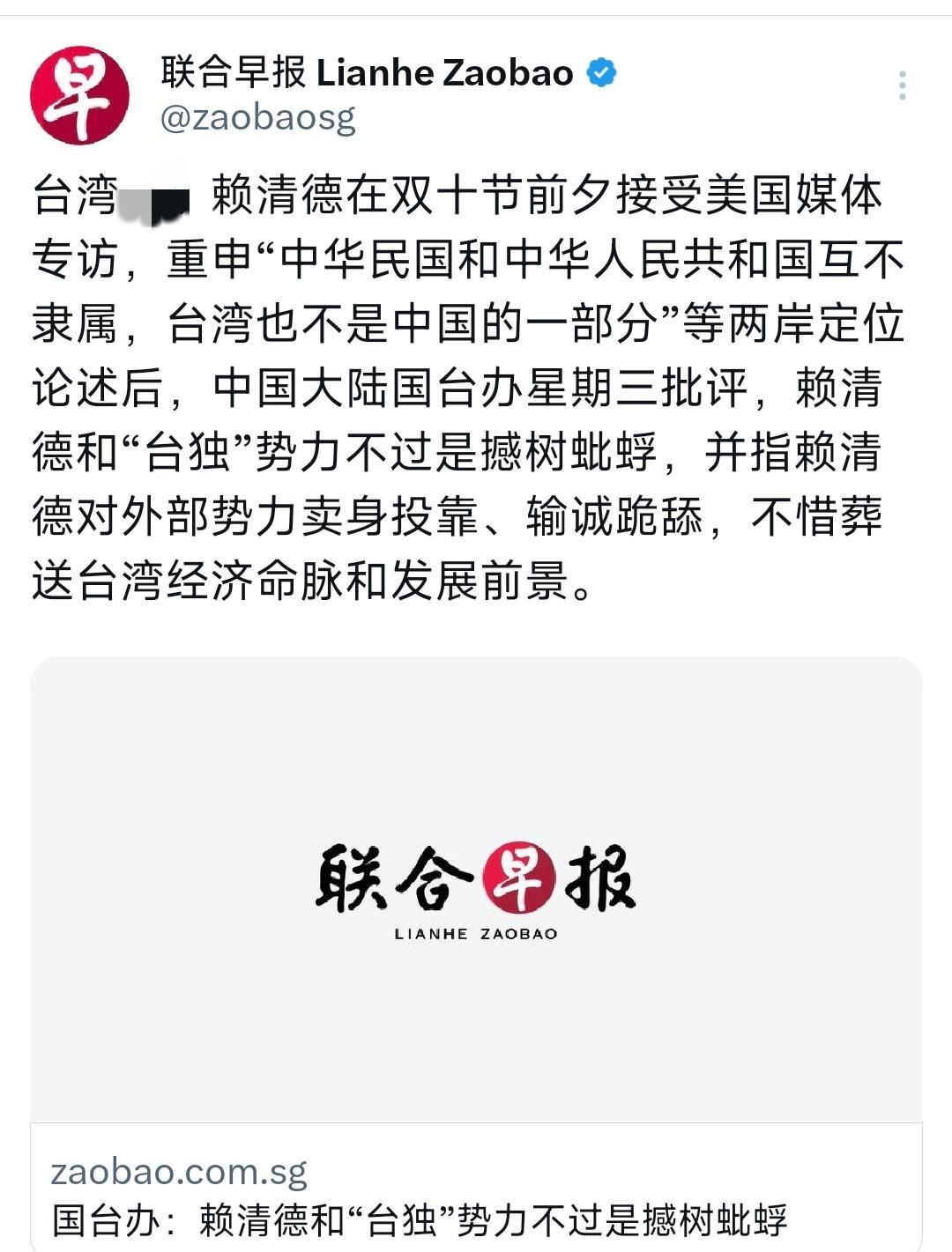 新加坡联合早报今晚(10月8日晚)写道:“赖清德在双十节前夕接受美国媒体专访,重申‘中华民国和中华人民共和国互不隶属,台湾也不是中国的一部分’等两岸定位论述后,中国大陆国台办星期三批评,赖清德和‘台独’势力不过是撼树蚍蜉,并指赖清德对外部势力卖身投靠、输诚跪舔,不惜葬送台湾经济命脉和发展前景。” [机智]评几句:赖清德的“台独思维”根深蒂固,不可能有任何改变。在双十节前夕的“台独”叫嚣,不过是其自导自演的一场政治闹剧。赖清德妄图通过外媒(美媒)炒作,将“互不隶属”的谬论包装成“国际共识”,实则是向美国主子递上的投名状。国台办“卖身投靠”的定性一针见血——当台湾半导体产业沦为美方制裁工具,当台商被逼“选边站”时,赖清德之流早已把台湾出卖得彻彻底底。历史铁律昭示:分裂者必遭唾弃,卖国者终被清算!