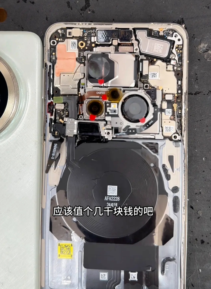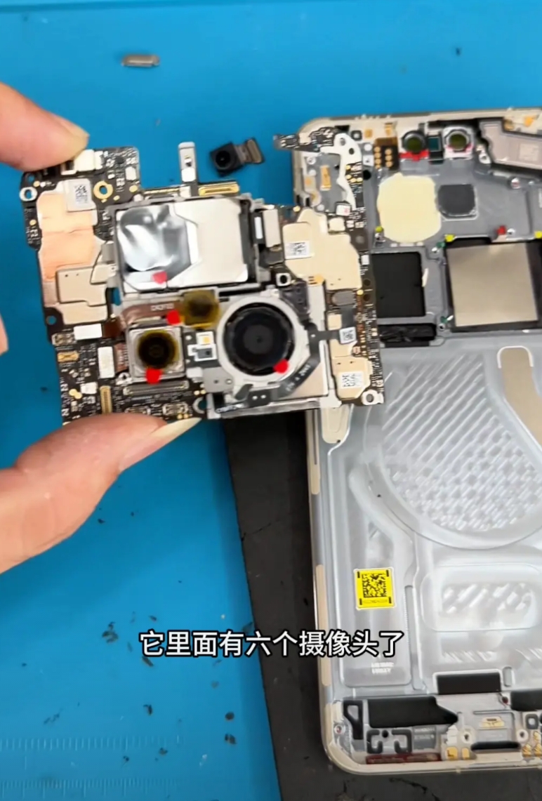 mate70pro+拆解。 华为Mate70pro,怪不得这个手机这么贵。里面的料堆的满满的,这里多复杂,没点技术真不好拆。就这几个摄像头应该值几千块钱。 假如要换电池,得把后面拆起来,还要拆屏幕,把屏幕还得拆起来。拆起之后电池排线在里面。拆开主板之后,里面有六个摄像头,两个是前摄,这四个是后摄。它这个摄像头多大?感觉比主板都还大了。这个摄像头怪不得这么贵。