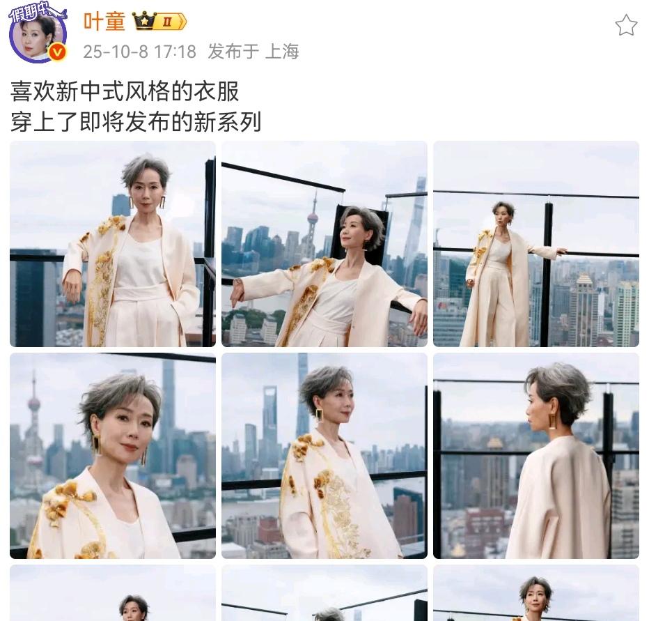 叶童说她喜欢新中式风格的衣服!这不,还没发布的系列就穿上身了,足以说明够喜欢!各位,你们觉得叶童穿新中式风格的衣服好看吗? 个人觉得还是蛮好看的,不过我感觉叶童身上穿的这个新中式风格的衣服,款式是没问题了,叶童能穿出那个味,但这个颜色好像和叶童不怎么配,穿不出让人眼前一亮的新中式韵味。 说到底,就是颜色不对呗!60岁以上的女人,其实穿新中式风格的衣服真的很好看,只要颜色选对,就会美翻天…… 嘿嘿,60岁的以上的你,喜欢穿新中式风格的衣服吗?