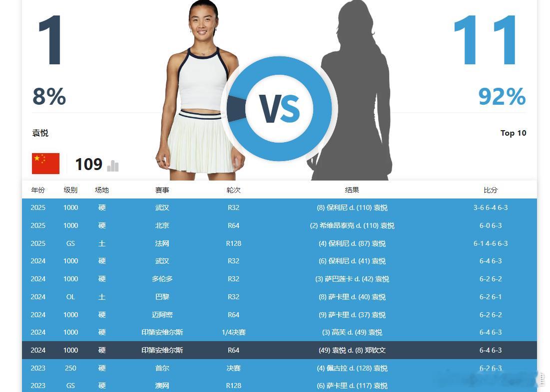 袁悦好可惜,对泡里尼0胜4负,对TO10遭遇八连败(其中3负泡里尼),即时排名NO.108。