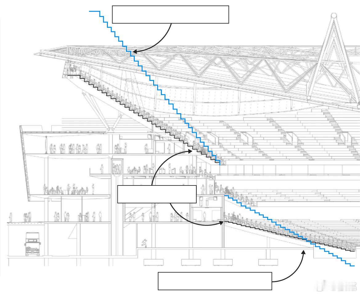 酋长球场的扩建会跟安菲尔德不一样,安菲尔德是扩建一侧看台。而酋长球场的主框架不会大变,但会整体调整坐席。如图三所示,目前的看台是比较平缓的斜坡,要改为更高,更陡峭,这样四面看台可以“抬高”,而低层看台也还会向场内延伸。简单理解,如果增加20排,每排1000人,那就是2万人座位。