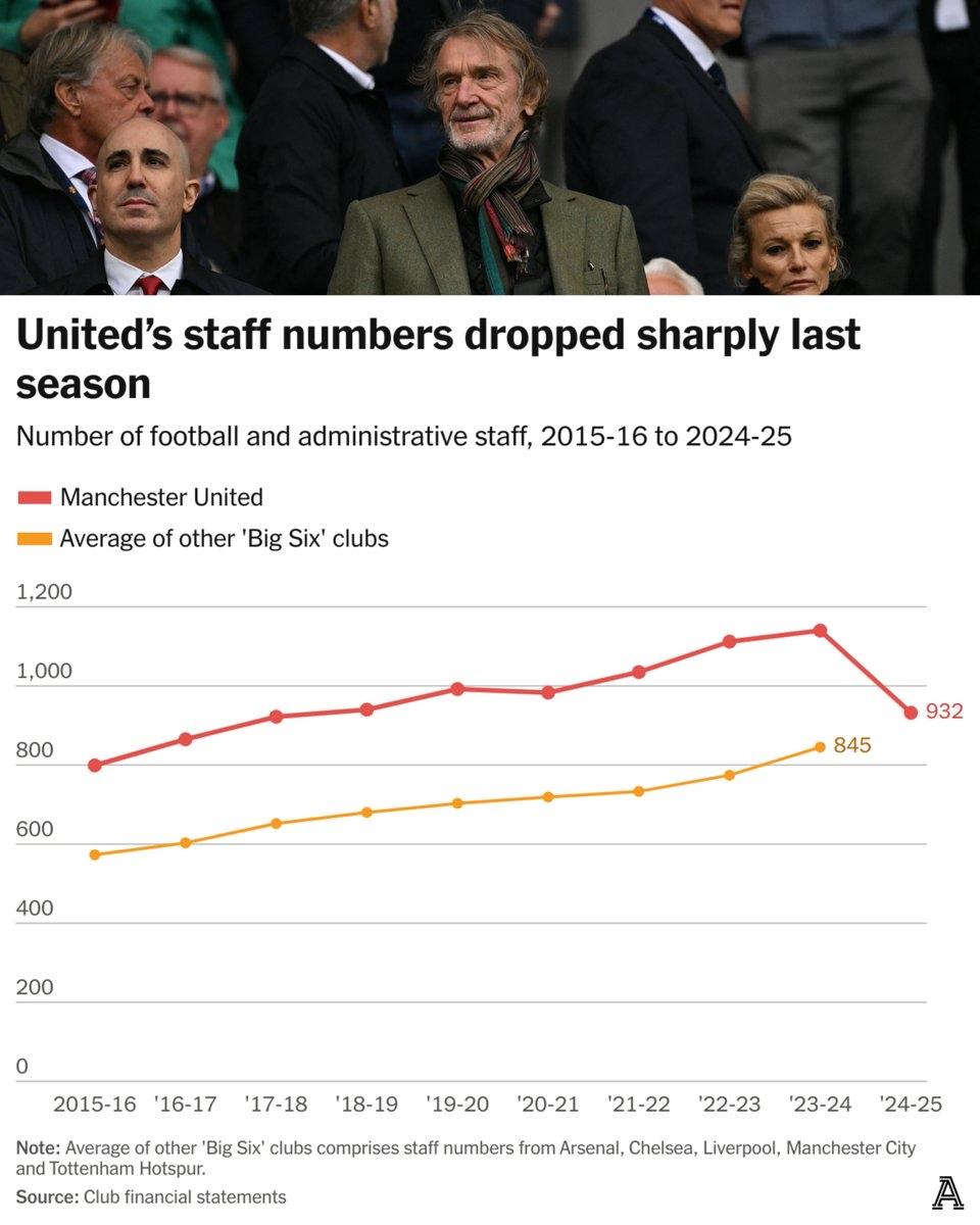 拉爵的目标是让曼联职员人数低于英超前6的平均水平。 🔵那还要裁100个,加油吧