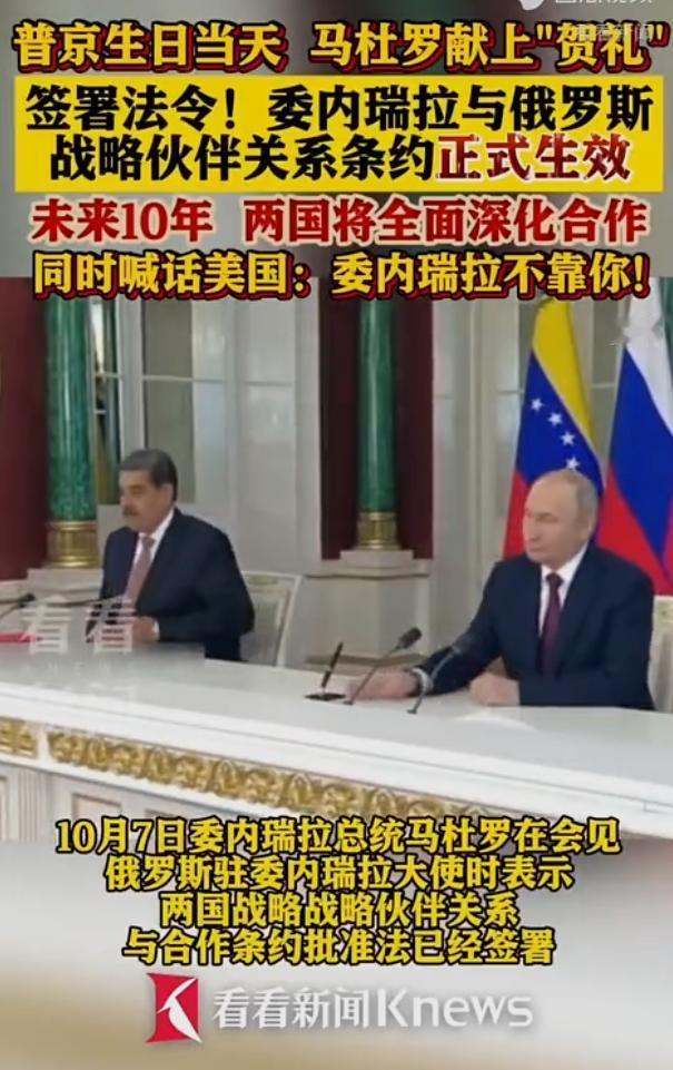 普京生日当天,马杜罗送来一份普京最想要的大礼!美国家门口未来十年将从此不得安宁!俄罗斯与委内瑞拉签署一份重磅法令,这份法令加强委内瑞拉与俄罗斯的战略合作伙伴关系和合作条约批准法,自签署当日起就生效, 美国万万没想到,一下子把委内瑞拉完全推到了俄罗斯这边,俄罗斯与委内瑞拉成为战略合作伙伴后,俄罗斯对美国的战略打击随时能直接装在美国的家门口,这下美国估计很难睡好觉了, 原本美国对是否对委内瑞拉是否下手还在犹豫,尽管已经军队压上委内瑞拉的附近海岸,甚至美国防长已经获得了一切行动的行使权, 俄罗斯和委内瑞拉的战略合作打得美国一手措不及防,特朗普估计要坐不住了!大概率要施压俄罗斯了,很可能继续拱火乌克兰那边!