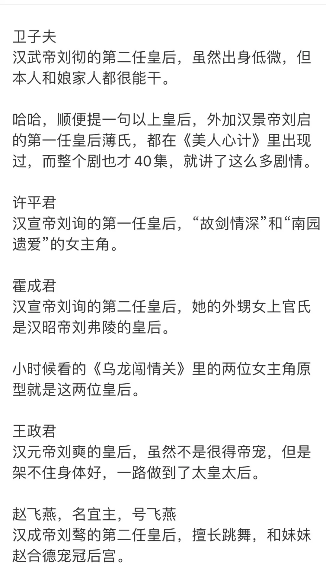 哈哈,顺便提一句以上皇后,外加汉景帝刘启的第一任皇后薄氏,都在《美人心计》里出现过,而整个剧也才40集,就讲了这么多剧情。