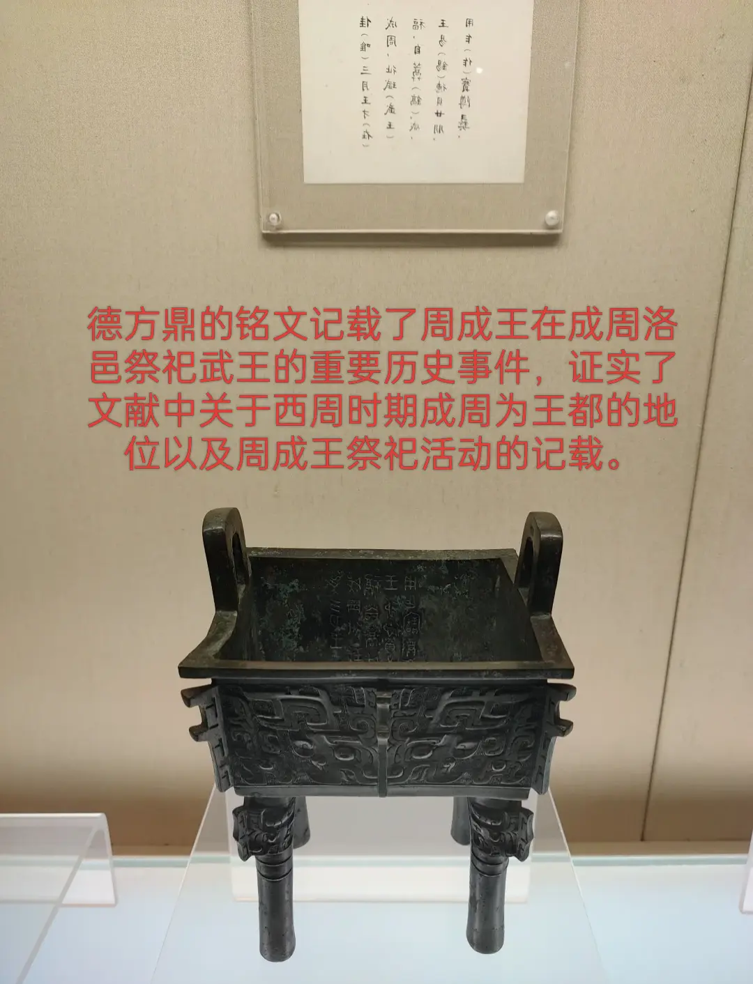 - 历史价值:德方鼎的铭文记载了周成王在成周洛邑祭祀武王的重要历史事件,证实了文献中关于西周时期成周的地位以及周成王祭祀活动的记载,为研究西周的礼仪制度提供了实物依据,同时其铭文中的文字对于研究中国文字的演化也具有重要价值。实证了成周为西周都城的历史!