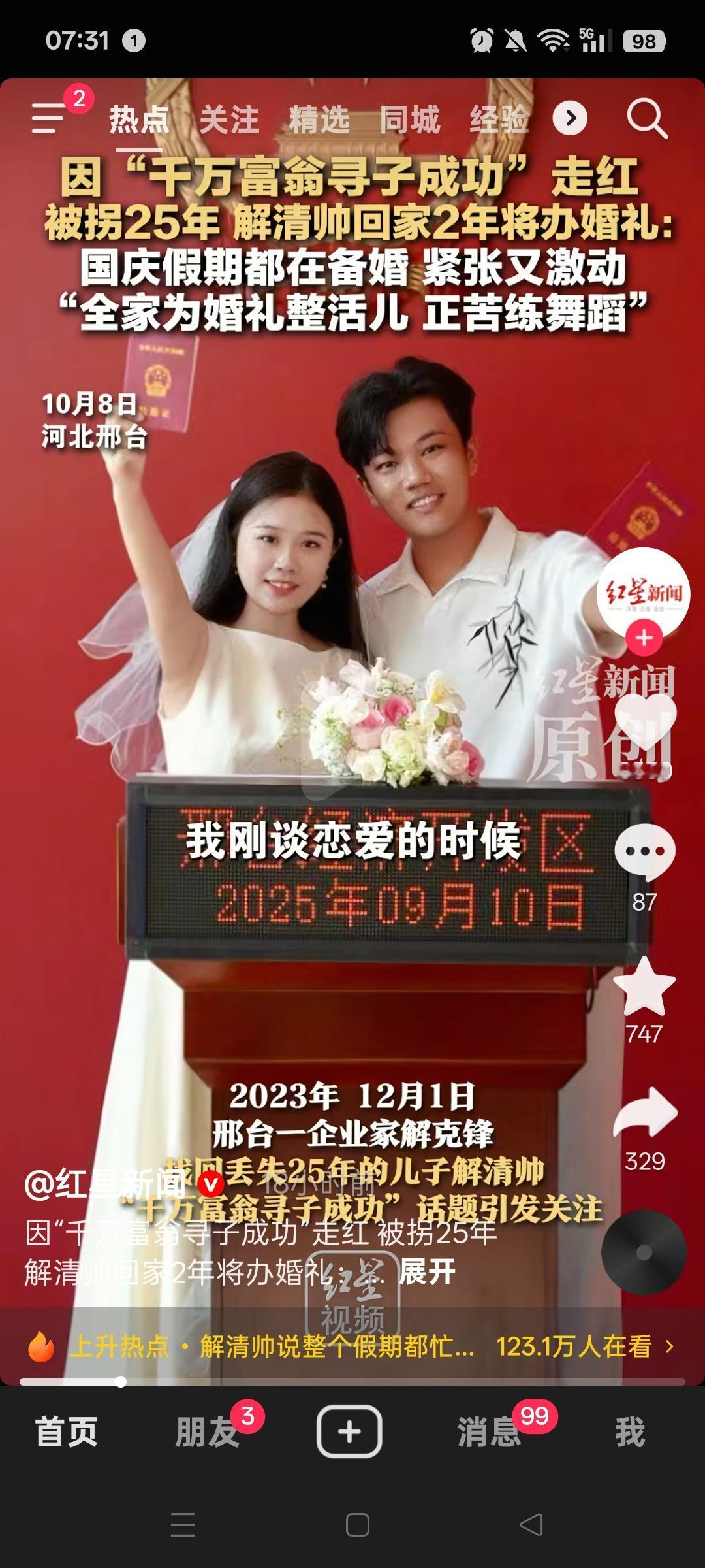25年寻子路,终于与失散多年的儿子解清帅重聚。更令人倍感欣喜的是,解清帅将于10月12日在河北邢台举办婚礼。国庆假期里,全家人都沉浸在筹备婚礼的忙碌与喜悦中。 解清帅与女友王正正自大学时期便结缘,历经四年的爱情长跑,感情愈发深厚。为了全力支持解清帅的事业,王正正毅然辞去了原本的教师工作,转而投身直播带货行业,而且取得了相当不错的成绩。尽管他们一家从事带货行业时遭遇了部分网友的非议,但解清帅始终保持乐观的心态。值得一提的是,解克锋还特别邀请了一些寻亲家长参加此次婚礼,其中杜小华也将到场见证这一幸福时刻。这场婚礼,无疑是解家的一大盛事。解清帅 解清帅 解清帅恋情