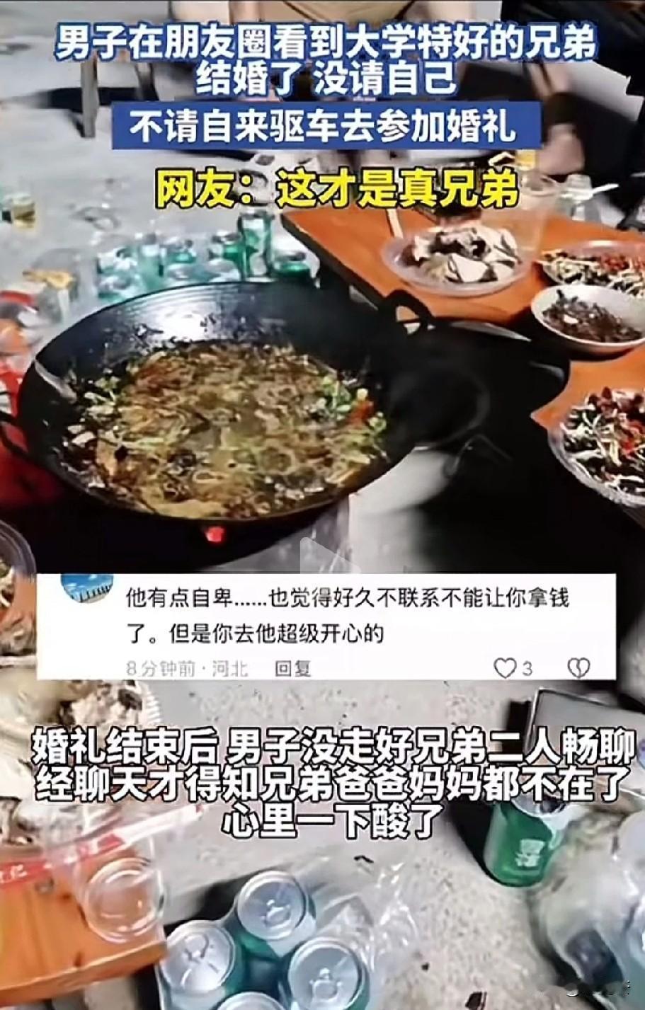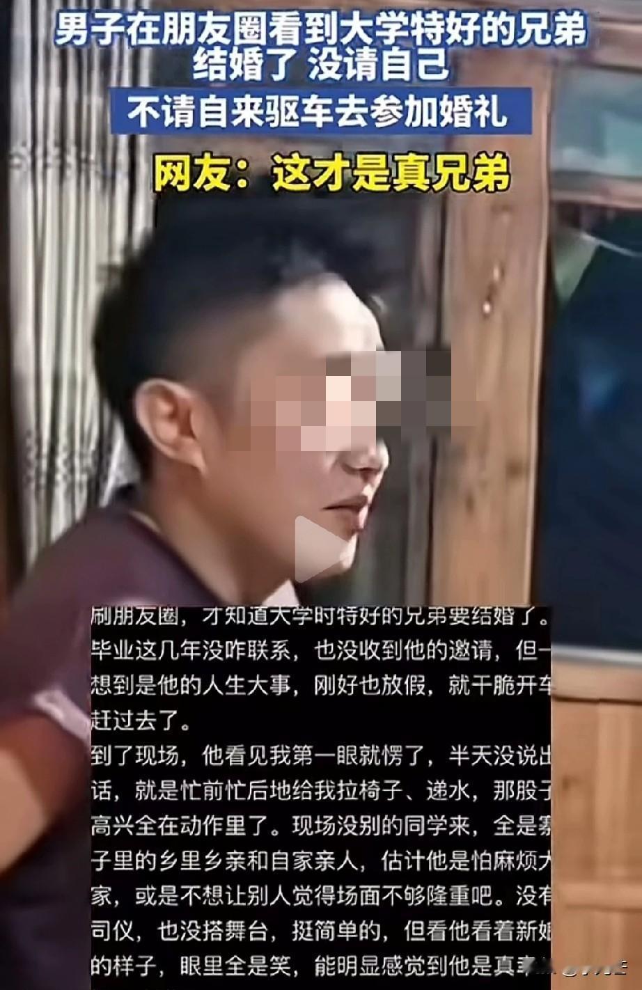 一男子说在朋友圈看到大学最好的兄弟,发了电子邀请函要结婚,他满心欢喜的等着兄弟给他发微信,没想到临近婚期兄弟也没通知他。虽然说喜事不请不去,但是想到是大学的好兄弟,又是国庆假期,他还是自驾开车去了现场。好兄弟看到他瞬间红了眼,激动的搬椅子,倒水,递喜糖,男子红着眼看着新郎官。 婚庆现场十分简单,没有司仪,没有主持,朋友和同学一个没来,全是村里的亲戚帮忙操持了婚礼,唯一比较欣慰的是,新郎官眼里全是新娘,掩饰不住的爱意,虽然现场十分简单,但是两人眼里全是对方,很幸福。 等到婚礼过后,男子和新郎官聊天才得知,新郎爸爸妈妈都去世了,办这个婚礼觉得十分寒酸,别人同学的婚礼都是风风光光,自己有些自卑,所以谁也没通知。 男子听完心疼不已,他知道好兄弟这个婚结的多么不容易,两人都进入社会,再也不像大学里的象牙塔。男子很庆幸,没有缺席好兄弟人生最重要的场合,不然会遗憾一辈子。 他摆摆手对新郎官,我们之间不用那些客套的话术,只要你需要我,我能到跟前就够了。 新郎官听完后,早已红了眼,拉着他激动不已,很感谢还有这一份大学情。 有人说喜事不通知还去了,男子的格局大情义重,这样的才是真兄弟!