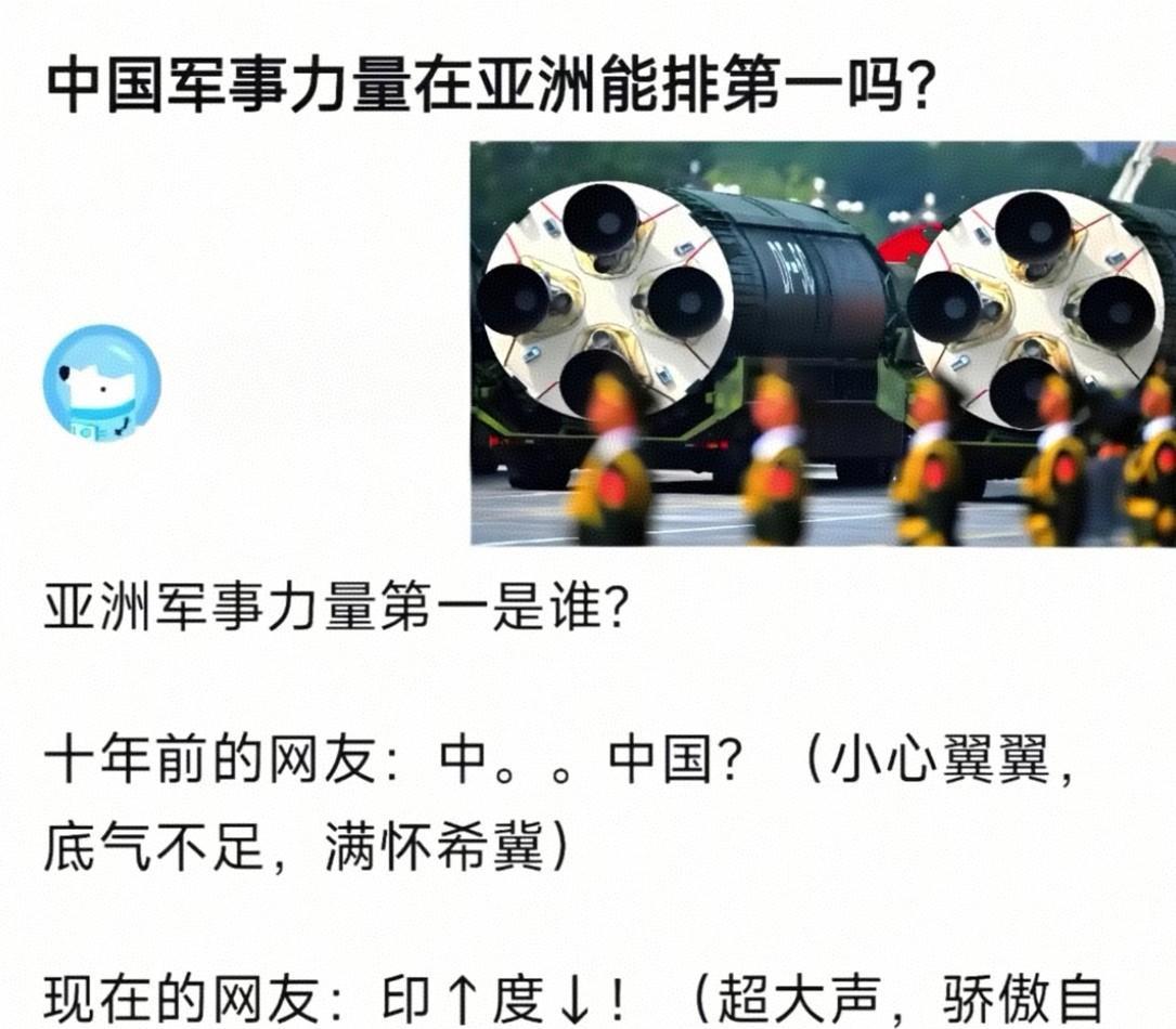 亚洲第一发达国家,人口世界第一,还硬刚鹰酱,除了白象还有谁?咱们还只是发展中国家,亚洲第一还是让给白象吧! 二十年前的时候,我在网吧打开电脑就会点开铁血、新浪和凤凰网,那时候我们只敢说我们陆军天下无敌,已经十多年不用去网吧上网了,偶尔还会看看军事新闻。但是也敢说我们海军和空军完全发展起来了,火箭军更是在亚洲无敌了。 军事发展让我们有了足够的底气和自信,如果一个人说刘亦菲或者迪丽热巴丑,她们听了难道会生气吗?当你强大了,你真的不在乎别人的贬低!